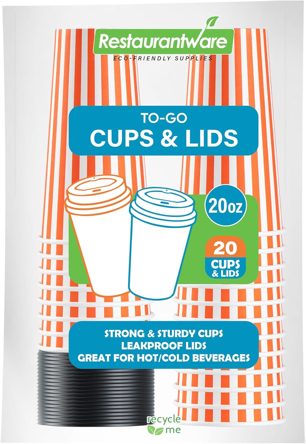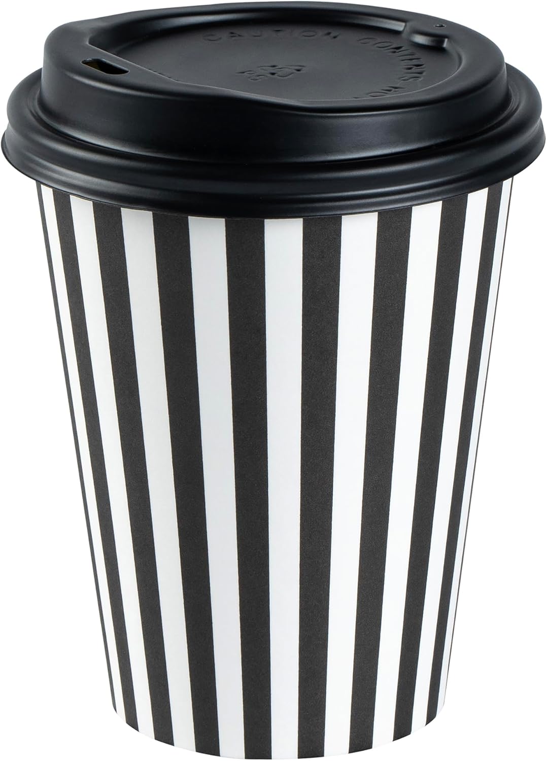 Upgrade your coffee service with our Restpresso 12-ounce Black and White Stripe Paper Single Wall Coffee Cups. These paper coffee cups are designed with a greaseproof PE liner, ensuring beverages stay contained and devoid of leaks. Single wall construction makes these disposable hot cups ideal for both hot and cold beverages, giving your patrons the flexibility to enjoy their favorite drinks. With a leakproof black lid, these cups for coffee let you carry your beverages without any mess. The eye-catching striped finish of these single-use coffee cups adds a touch of sophistication to any cafe or restaurant. Easily stackable, these coffee cups save valuable storage space in your establishment. The rolled rim of these single wall coffee cups ensures a comfortable and secure grip, while the durable seam provides confidence in every sip. Pair these coffee cups with our selection of coffee cup sleeves, which provide a better grip on the cup, reducing the chances of accidental spills or slips. With a 12-ounce capacity and measuring 3.5 inches in diameter by 4.3 inches in height, these hot tea cups are perfect for serving a variety of beverages. Sold in a 20 count box. Sleeves are available and sold separately.