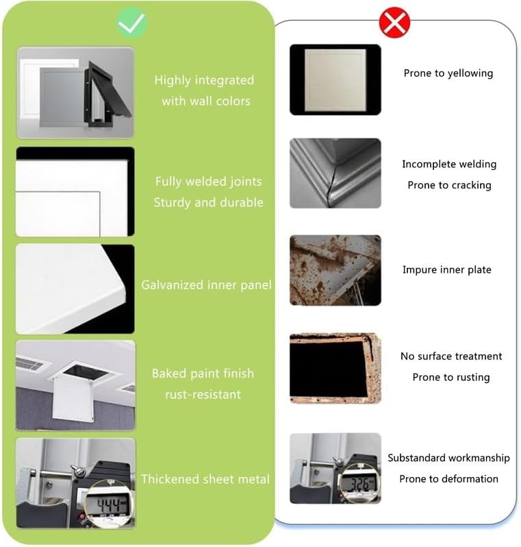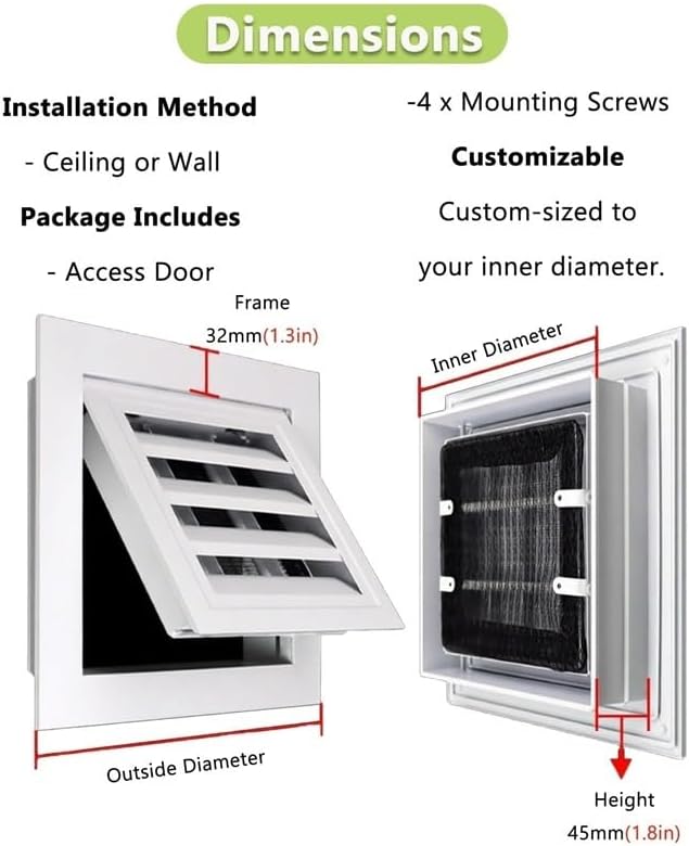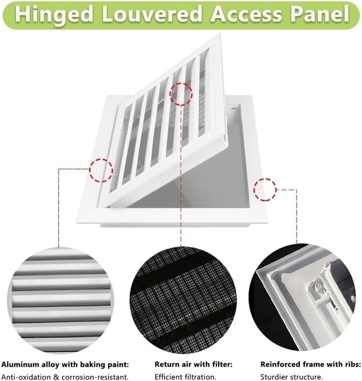 Whether you‘re a homeowner, contractor, or facility manager, our hinge-type louvered access panel delivers convenience, cleanliness, and durability in one sleek package. For homeowners, it means no more fumbling with cumbersome panels when fixing a leaky pipe or adjusting HVAC \u2014just a quick lift to access what you need, all while keeping your living space looking neat. And throughout it all, the built-in filtration ensures the Gas in any space stays cleaner, making it a smart choice for anyone who values both functionality and a healthy environment.Material: Aluminum Alloy Frame + Galvanized Inner PanelDimension: CustomizableApplication: Residential buildings, apartments, shopping malls, hotels, office buildings ETCColor: WhiteFeatures:- Aluminum alloy with baking paint, anti-oxidation.- revert Gas with filter, efficient filtration.- Reinforced frame with ribs, sturdier structure.Packing List:1 x Aluminum Alloy Inspection HatchTips.1. Prevent scratches; clean stains with water. Polish cut edges after cutting to avoid .2. Do not place heavy objects or step on it; add a reinforcing frame if needed.
