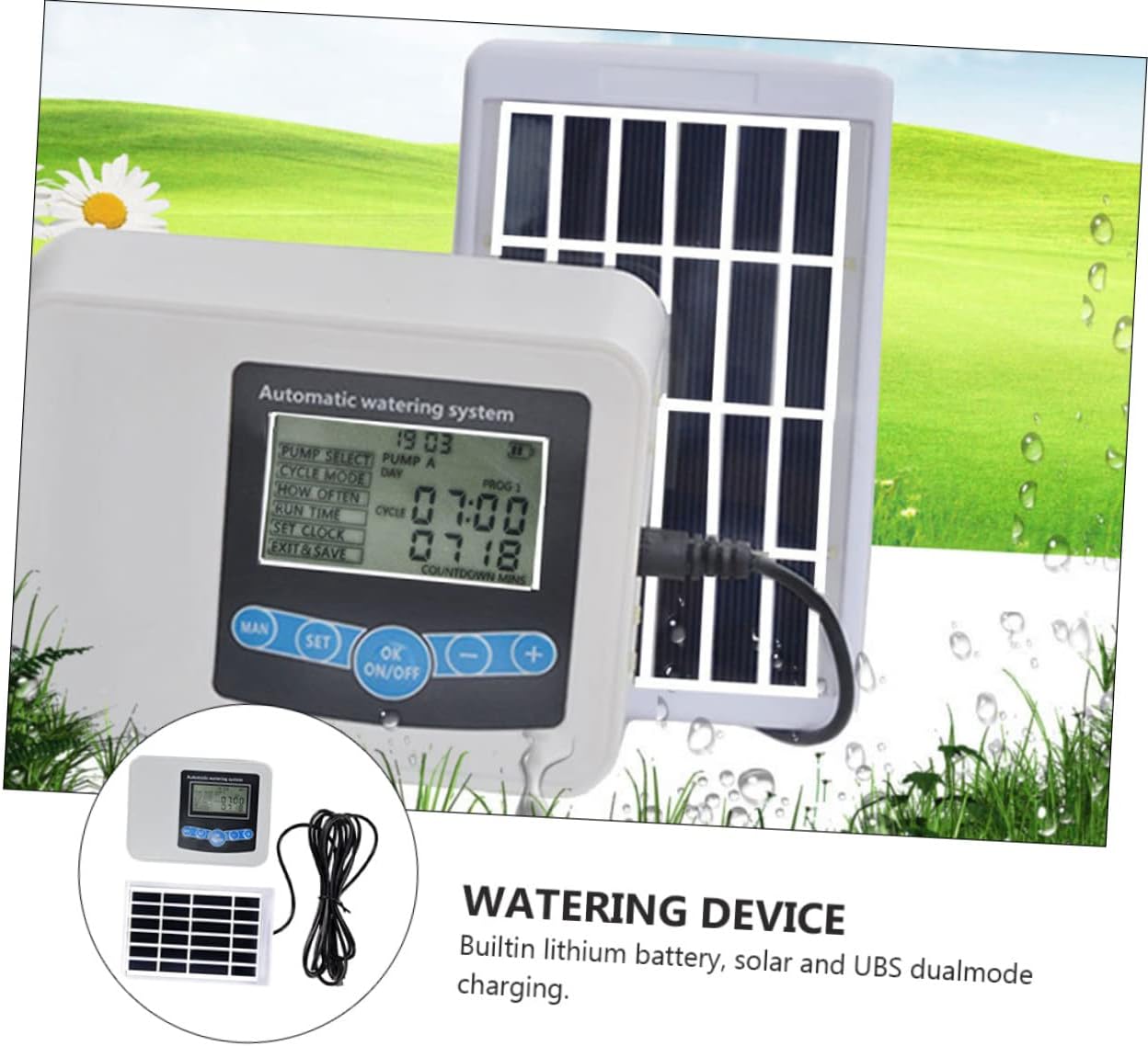 Package Include 1 x watering timer 1 x USB cable 1 x solar panel Features - Input voltage: 4.2V-5V irrigation controller. - Interface type: micro USB automatic watering controller. - Waterproof grade: PI67 rainproof watering controller. - Pump flow: 850ml/min irrigation timer. - Motor power: 5W solar watering timer. - Size: 12.00X8.90X4.30cm/4.72X3.50X1.69in watering device - Battery voltage: 3.7V. - Material: ABS. - Battery capacity: 1200 mAh. - Color: As Shown. - Made from for use. for home, garden and agriculture production use, etc timing watering device. - There are two recurring modes based on days and hours to meet your need double pump watering timer. - Set three groups of watering time arbitrarily , the watering 0-9999 seconds watering timer. - It is easy to install and convenient to use. Built-in solar and USB dual-mode charging digital water timer. - Equipped with two water pumps , which can be selected arbitrarily, and also can work alone.Goods Descriptiondouble pump watering timer Perfect for garden and home use.watering device one of the for you.automatic watering controller automatic watering timer, made from material, is and for long time use.irrigation controller Double pump water supply, can be switched to single pump, can adjust the output water size to meet the needs of different flowers