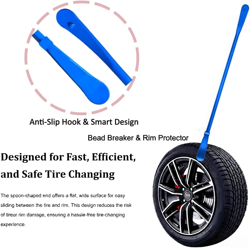 Engineered for Heavy-Duty Tire Service: This professional tire changing kit includes two solid 38-inch steel tire irons, specifically designed for mounting and demounting large, stubborn tires on trucks, SUVs, and semi-trucks. The dual-tool setup allows for superior leverage, making bead breaking and tire removal significantly faster and easier on heavy-duty applications. Built for Maximum Durability & Corrosion Resistance: Constructed from hardened 45# carbon steel, these tire spoons are built to withstand extreme prying force without bending or breaking. The protective anti-rust coating ensures long-term durability in professional garage or outdoor environments while providing a smooth, secure grip during use. Smart Design Prevents Rim Damage & Improves Safety: The specially angled and curved tip securely hooks onto the wheel rim, preventing dangerous slipping that can scratch expensive rims or cause injury. The precision-machined edge glides effortlessly between the tire bead and rim, ensuring a smooth, controlled, and efficient tire disassembly process. Wide Compatibility with Tubeless Tires: Designed to work with most standard-sized tubeless tires for light trucks, heavy-duty SUVs, and commercial vehicles. This versatility makes it an essential toolkit for professional mechanics, fleet maintenance teams, and serious off-road enthusiasts seeking reliable tire change tools. Enables Fast, Solo Tire Changes: Achieve professional-level results independently. The optimized length and strength of these tire bars empower a single user to quickly and safely replace even large, heavy tires, reducing downtime during roadside emergencies or in-shop service.