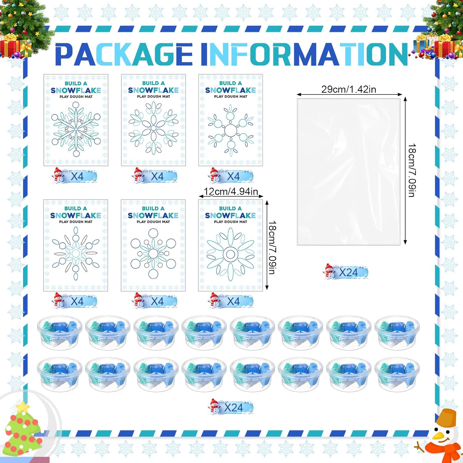 Features: Party Favors: Throw the snow party of their dreams with our fun and festive party kit, perfect for birthdays, holidays, or any occasion that calls for a celebration with family and friends! Wide Application: These snowflake craft can be applied as a warm gift for everyone. Snowflakes DIY craft kits is widely applied in various occasions, Such as Christmas party favors, Christmas decorations, DIY Christmas crafts and party games toys, etc. Specifications: Material: Task cards: paper Clay: Color: Task cards: blue Clay: white and blue Size: Task cards: 7.87 x 5.51 inches/ 20 x 14 cm OPP bag: 7.09 x 11.42 inches/ 18 x 29 cm Package includes: 24 x Task cards: 24 x Clay 30 x Opp bag Notes: Manual measurement, please allow slight errors on size. The color may exist a slight difference due to different screen displays The product description reads: "Suitable for adults/people aged 14 and above"