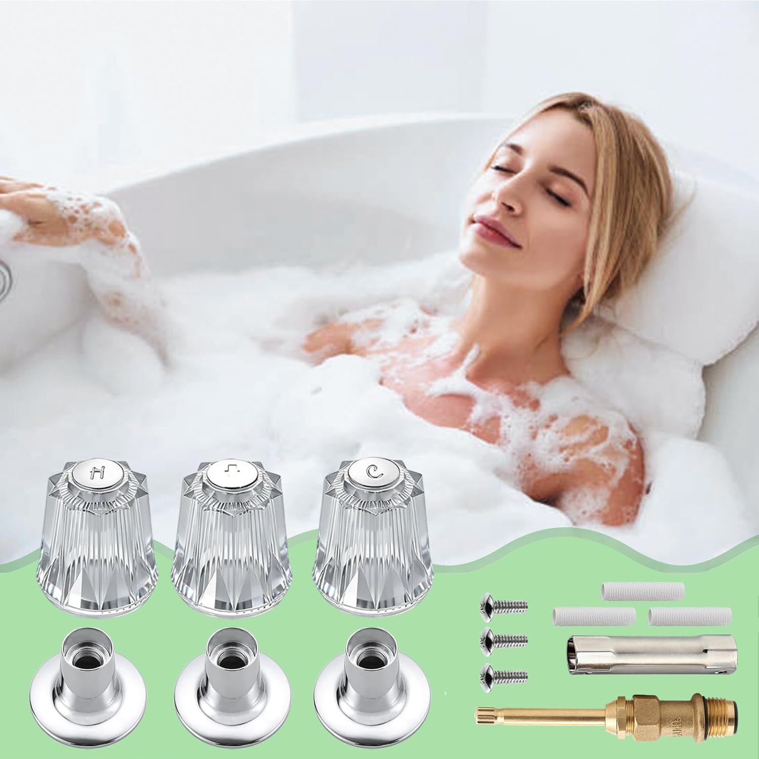 39619 Bathtub Shower Handle Remodel/Rebuild Trim Kit, Shower Knob 3 Piece for Price Pfister Verve Faucets, Includes 12H-2H, 12H-2C, 12H-18D Stems and Tubs knob Handle and Flange Base Product Name: Bathtub Shower Handle Remodel/Rebuild Trim Kit Color: Clear Acrylic, Chrome, Brushed Nickel, Matte Black Valve Stems Material : Brass Style: Classic Handle Type: Shower knobs Valve Stems Size: Length:5½”(14cm) Thread Diameter: 7/8"(2.2cm) Hot and cold shower knobs are an essential part of any shower system, providing both practical functionality and stylish aesthetics. Whether you prefer a sleek, minimalist look or a more ornate design, this handle has something for every taste. The knobs come with all the necessary hardware, making them easy to install or replace for both professional plumbers and DIY enthusiasts. Whether you are renovating your bathroom or simply replacing an old fixture, hot and cold shower knobs are a great choice to improve the functionality and appearance of your shower. Package Contains: 1x Hot side shower faucet handle 1x Cold side shower faucet handle 1x Diverter shower faucet handle 3x index button and handle screw 3 metal flange bases 12H-2H stem, 12H-2C stem, 12H-18D stem 1 socket wrench Note: Please check stem and old handle dimensions before ordering, the tip of the stem should have a 12-point broach for proper fit to the handle.