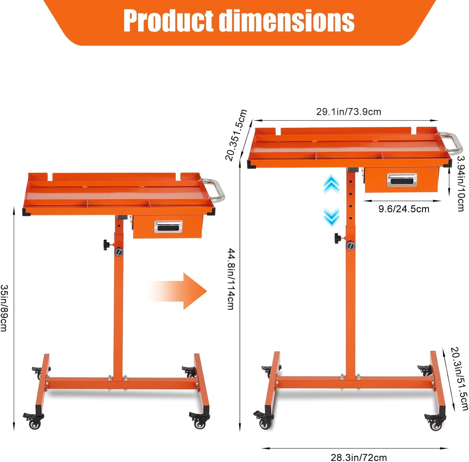 Adjustable Work Table with WheelsTackle any garage project or DIY repair with ease—our Adjustable Work Table with Wheels glides effortlessly by your side, keeping your tools and parts organized and within arm's reach wherever you work.Highlights at a Glance:- Adjustable height from 35" to 44.8" for ergonomic comfort- Heavy-duty metal frame supports up to 220 LBS- Spacious 29" x 20.4" tray fits large and small tools- Divided compartments keep parts organized and accessible- Durable powder-coated finish resists water and rust- Four universal casters for smooth, easy mobility- Lockable wheels ensure stability during use- Perfect for garages, repair shops, and DIY projectsSpecification:- Material: Iron- Weight Capacity: 110 LBS- Adjustable Height: 35"-44.8"- Table Size: 29.1" x 20.3"- Available Color: Black, Orange, GreenPacking List: 1 x Rolling Tool Tray1 x Hardware Bag1 x User ManualFriendly Note:1. Safe Movement: Make sure the pathway is clear before rolling the tray. Move it slowly and avoid abrupt stops to prevent tools from falling. Always lock the casters when the tray is in use to keep it steady.2. Safety: Keep the tray out of reach of children to prevent accidental injury. Do not use the tray as a step stool, seat, or for standing on.