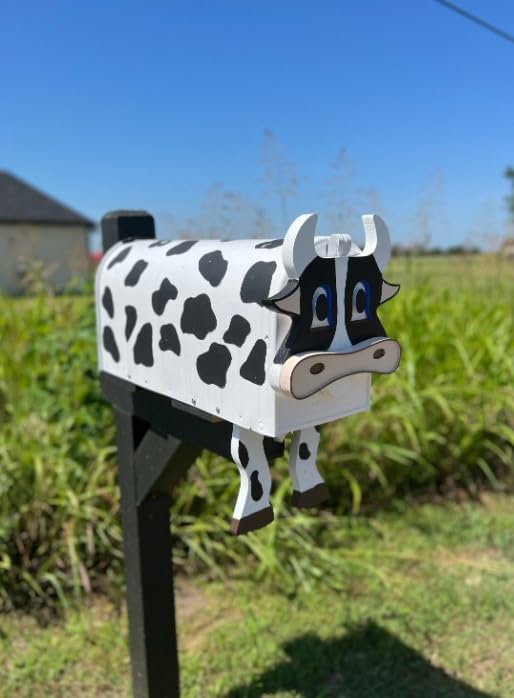 A handmade cute and adorable cow mailbox. This is not one of those garden decor only mailboxes, this is a real and functional LARGE mailbox. Galvanized steel post mount mailbox Treated wood to withstand the elements! Comes with mailbox, cow head and legs firmly attached Mailbox dimensions: 8.7 in (22.1 cm) Width 10.9 in (27.7 cm) Height 22.6 in (57.4 cm) Depth 7 lbs