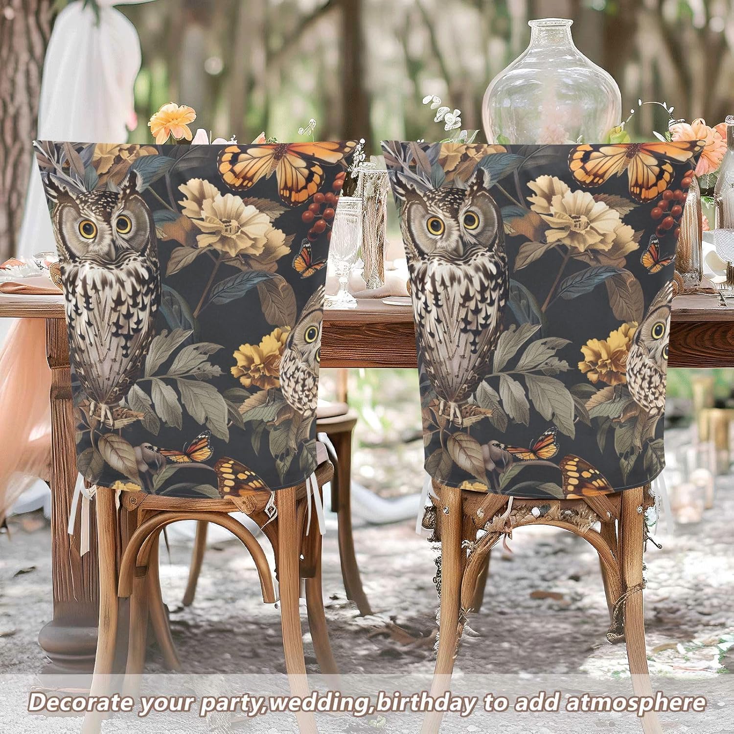 Chair Cover Material made of polyester,comfortable and soft to touch,reusable and suitable for long term use Features easy to install and remove, tie rope design at the bottom,machine washable Stylish Chair Decoration With beautiful pattern,it can be used for family party/ birthday party/wedding/ holiday party to add atmosphere, also can be used for chair decoration in living room, dorm, kitchen dining room,bedroom to bring protection to the chair while avoiding stains to dirty the chair back. Easy To Care Machine washable, Not washing with hot water, Not bleaching