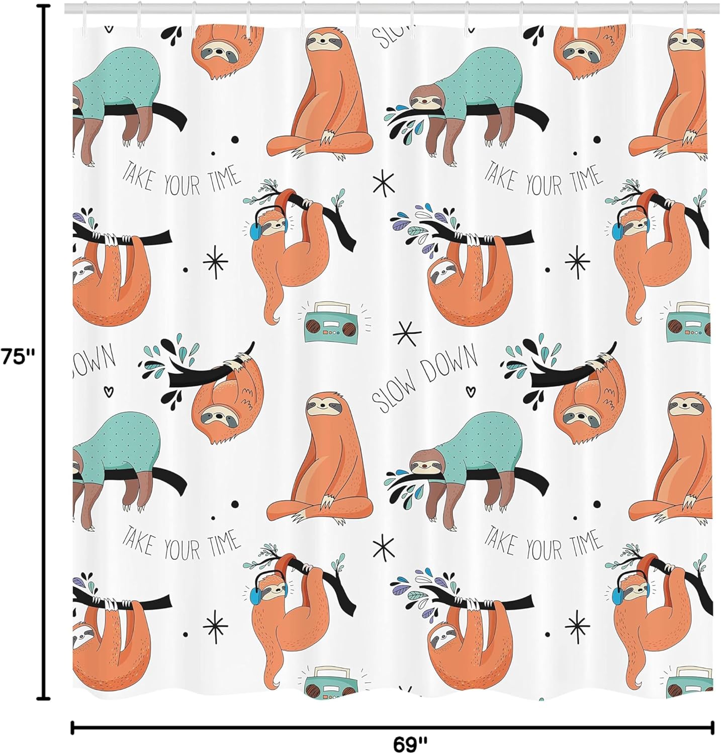 Ambesonne Sloth Shower Curtain, Pattern Hand Drawn Sloths on Branches Laziness Mood Words Fun, Cloth Fabric Bathroom Decor Set with Hooks, 69" W x 75" L, Pale Blue Orange Black