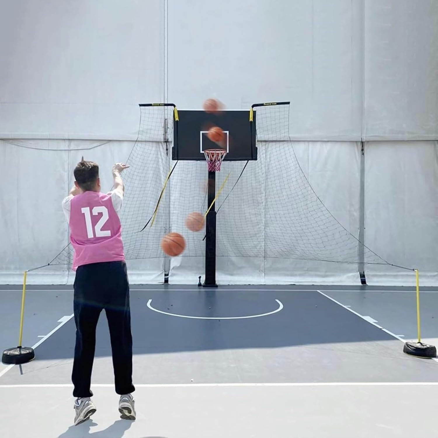 Time-saving & Keep Shooting- The basketball rebounder is designed for practice efficiency and technique improvement. The basketball hoop return system will return the ball to shooter, help the shooter maintain the shooting state, and adjust technical actions. It's best to use two balls at the same time, which will make the training effect more obvious. Perfect for basketball enthusiasts.? Specifications:- Color: Black + Yellow- Materials: Metal - Net Size: 4.8mx4.8m- Basket Width Range: 100cm-180cm.? Features: - Perfect for basketball enthusiasts.- Eliminating the hassle of chasing the shot. - The return attachment can improve your shooting skills.- The height design makes it suitable for most sizes of basketball hoop.- No tools required, improves shooting through uninterrupted repetition.- Perfect as a gift for kids, boys and girls who love the sport of basketball. - The assembly process is simple, it only takes a few minutes to install and set up.- The basketball shooting aid can correct shooting posture to fix and form muscle memory, improve your shooting percentage.? Package Included:- 1x Basketball Returns Net (with installation complete kit)? Note: - Manual measurement products may have dimensions of a few centimeters of difference, please understand.- There may be some differences between the image and the product due to display and lighting reasons, please refer to the actual product.If you have any questions please contact our customer service