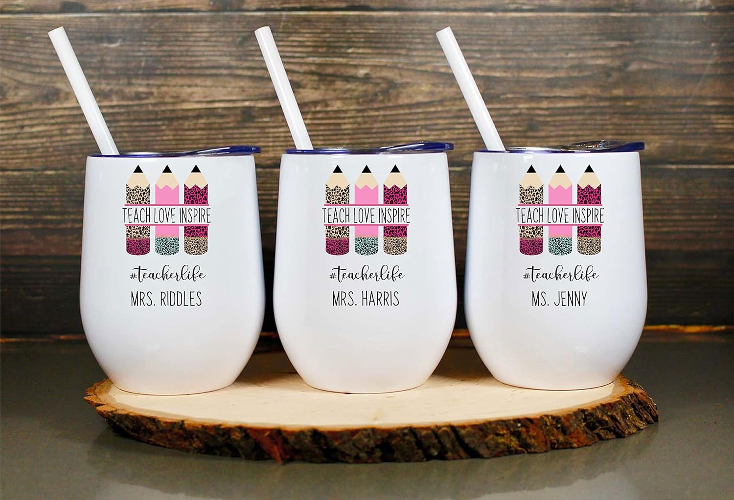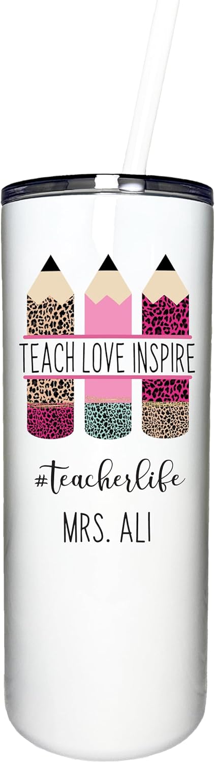 Our personalized tumblers make a great gift for the teacher in your life who deserves something special. We permanently print your design on your tumbler so it will last for years. The tumbler is a practical gift that is easy to keep clean. Our tumblers are vacuum-insulated stainless steel, so they keep drinks hot or cold for hours. Includes a straw and lid.