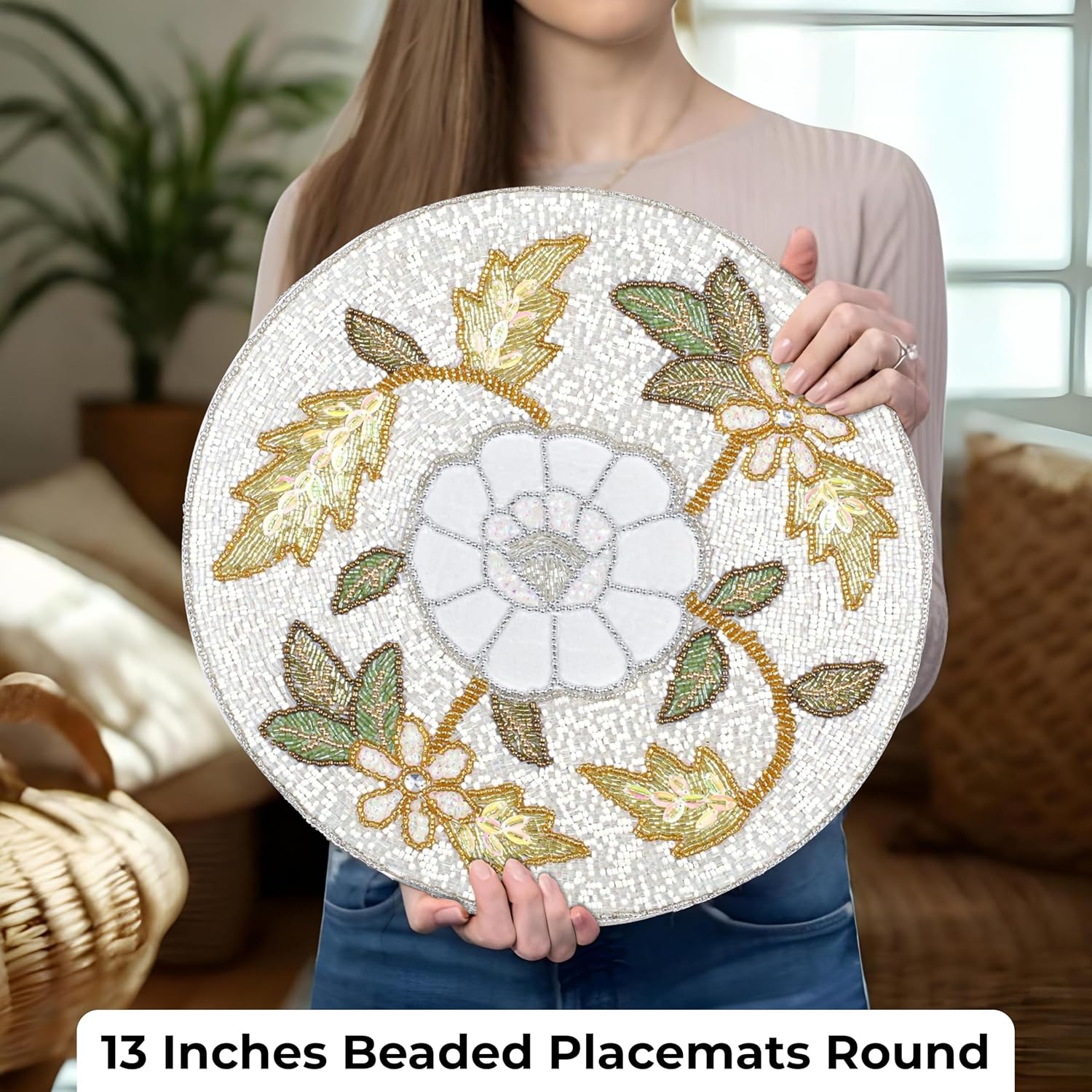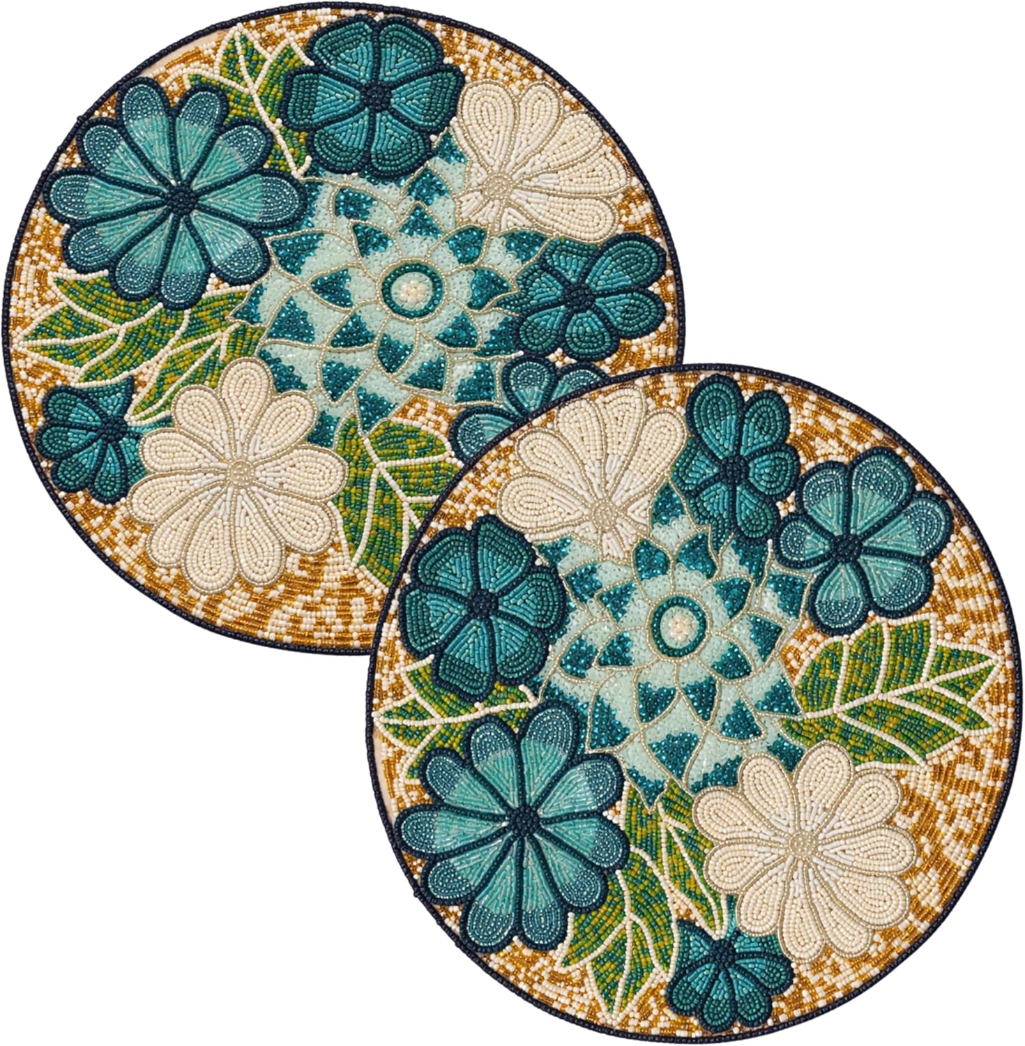 Olio Marfa Beaded Round Placemats for Dining Table Flowe Design Green Ivory Set of 2- 13 inches Beaded Placemats Round for Gathering, Christmas, Thanksgiving - Occasional Decoration