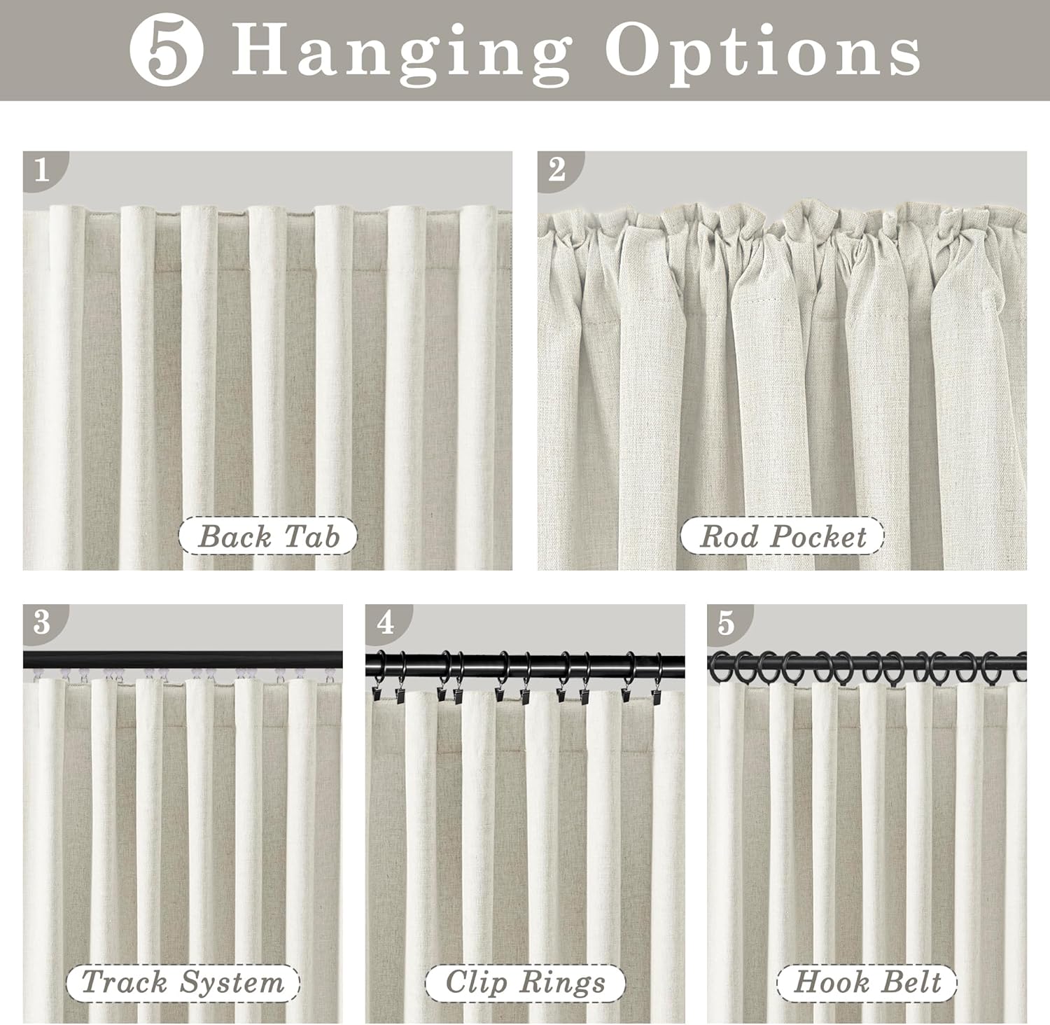 | topstyle | Hook Belt,Back Tab,Rod Pocket,Clip Rings,Track System |