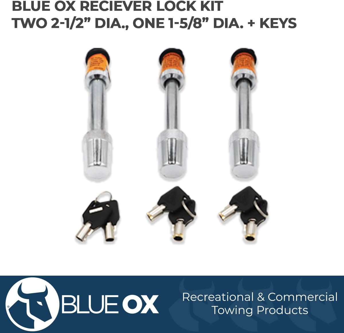 Blue Ox 3-Lock Kit includes two ½ inch locks and one 5/8 inch lock to secure the tow bar investment. It is designed to lock the tow bar to both the base plate and the receiver of the vehicle. This lock kit prevents accidental unhitching and has a sturdy construction for strength and durability.