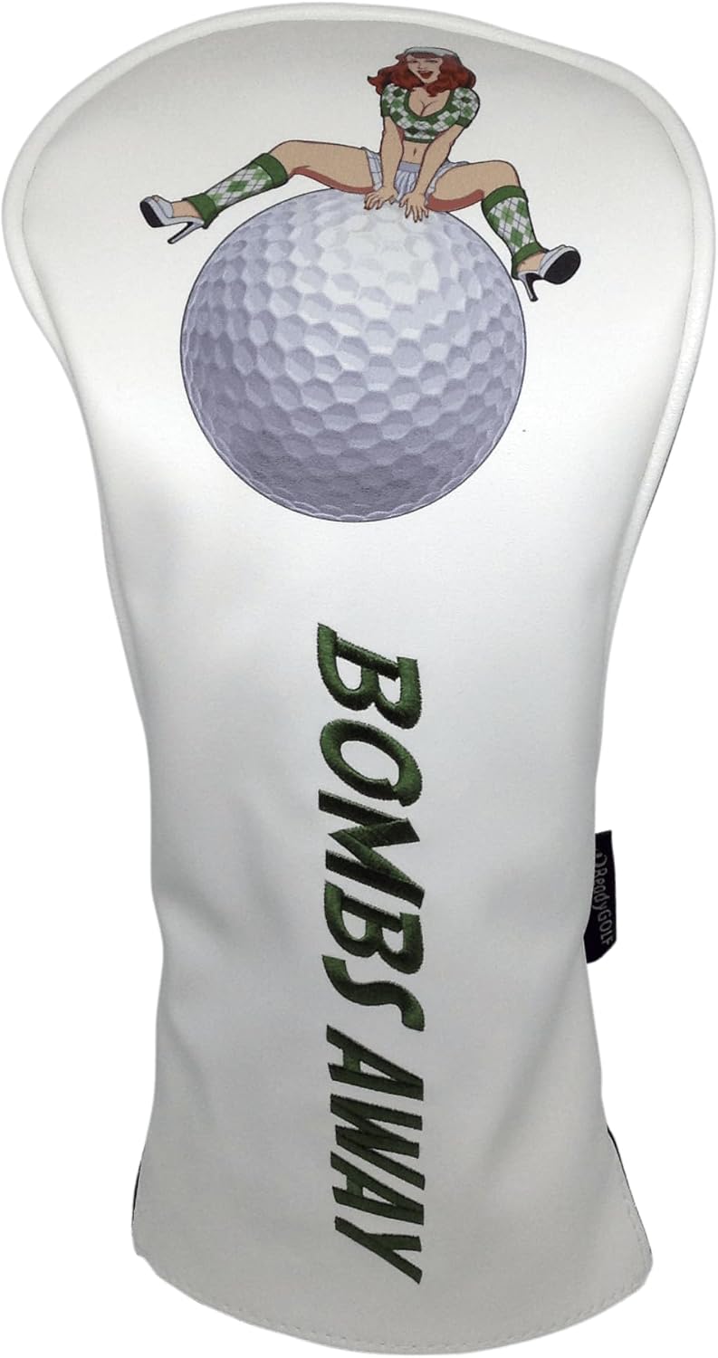 Bombs Away! Embroidered Pinup Driver Headcover by ReadyGOLF You step up to the tee. Your playing partners are watching. Your driver needs a headcover that matches your confidence—bold, classic, and impossible to ignore. Enter the Bombs Away! Pinup Driver Headcover: where vintage pinup style meets modern golf swagger, and every tee shot feels like a statement.The Bombs Away! Embroidered Pinup Driver Headcover by ReadyGOLF is an exclusive design that brings classic pinup art to the golf course. Featuring an iconic pinup girl riding a golf ball, this headcover is bold, eye-catching, and guaranteed to turn heads in your foursome. Made specifically for 460cc drivers, this premium embroidered headcover combines vintage Americana style with modern golf functionality. It's not just protection for your driver—it's a conversation starter, a style statement, and a celebration of personality on the course.At ReadyGOLF, we believe golf gear should be as bold and unique as the golfers who use it. The Bombs Away! Pinup Driver Headcover captures the spirit of classic pinup art—playful, confident, and unapologetically fun. Whether you're a fan of vintage style, retro aesthetics, or just want a headcover that stands out from the boring crowd, this exclusive ReadyGOLF design delivers premium embroidery, durable construction, and plenty of personality. Pair it with matching Bombs Away! fairway, hybrid, and putter covers to complete the look and own your style from tee to green. Key Features Exclusive Pinup Design: Iconic pinup girl riding a golf ball—bold, vintage, and one-of-a-kindPremium Embroidery: High-quality stitching for durability and visual impact460cc Driver Fit: Designed specifically to fit modern 460cc drivers