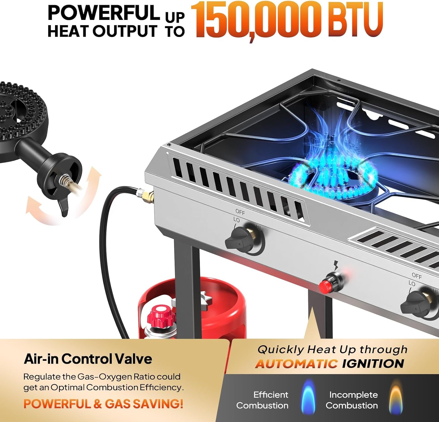 Powerful 150,000 BTU Dual Burner Outdoor Cooking System - Experience professional-grade performance with two intense burners featuring push-button ignition or instant startup and precise flame control from simmer to searing. The extra-wide shelf keeps all cooking essentials organized while heavy-duty wheels ensure easy mobility. Compatible with woks, stockpots and grill pans, it's perfect for boiling, frying or grilling at campsites, tailgates and backyard BBQs. Includes a regulator for safe operation (propane tank not included) - your all-in-one solution for outdoor cooking adventures!★ Features:1. Overall 150,000 BTU powerful output2. Easy control knob and auto-ignition3. Conveniently built-in shelf4. Universal cookware compatibility5. Smooth rolling wheels6. CSA-certified regulator7. Ideal outdoor cooking solution for camping and backyard★ Specifications:1. Material: Cast Iron & Steel2. Assembly Required: Yes3. Power Source: propane4. Net Weight: 37.03 Pounds5. Product Dimension: 54.33"L x 16.54"W x 37.8"H★ Package includes:1 * Gas stove1 * Regulator with hose1 * Instruction