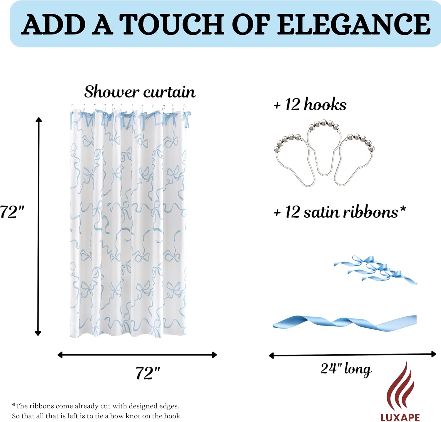 100% Polyester Elegant Design: Beautify your bathroom with the charming textured design of our lovely Riley Shower Curtain. The beautifully crafted bows cascade down the solid colored curtain, adding a delicate, feminine touch to your primary, guest or child's bathroom. Charming Details: This romantic, vintage glam shower curtain features handmade bows flowing down from the top of the soft brushed microfiber curtain. Add this beautiful, one-of-a-kind bathroom accessory to your home. Easy to Install: The 12 button holes at the top of this shower curtain make it easy to hang with hooks or rings, ensuring a simple installation process. Because this is a fabric shower curtain, we recommend pairing it with a liner, sold separately. Care And Maintenance: To care for this delicate shower curtain hand wash separately in cold water and hang to dry. Use non-chlorine bleach or a steamer if needed. Buy with confidence. This shower curtain is STANDARD 100 by OEKO-TEX certified, which means the fabric, dyes and all components have been tested in an independent laboratory and certified against a list of more than 350 harmful substances. About Us: Luxape crafts beautiful home decor for every room, style and age. Our luxury-for-less styles are designed to inspire. From timeless neutrals, rich textures and vibrant colors, we help you dress your space to reflect your personal style.
