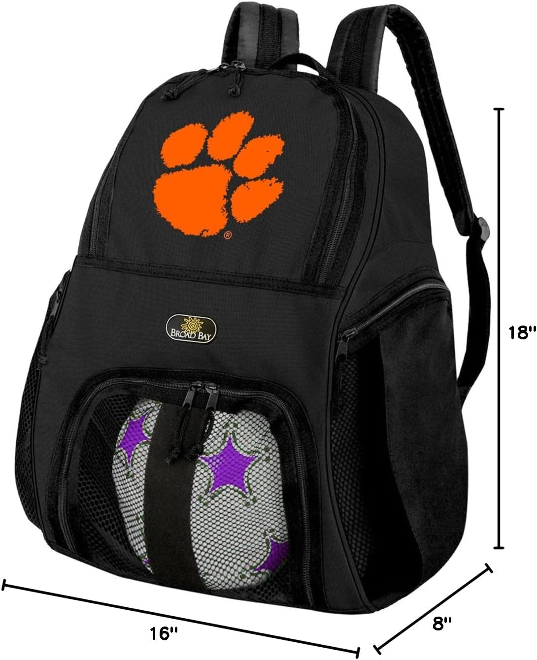 This OFFICIAL Broad Bay Clemson University soccer backpack or Clemson Tigers volleyball bag is the perfect solution for soccer or volleyball practice. The Broad Bay Clemson University soccer backpack bag is made of heavy duty 600 Denier Fabric with a waterproof backing. The mesh paneled interior ball compartment allows you to quickly and easily zip your ball right in and keep it separate from the main compartment. The main compartment of this great Clemson University Soccer Backpack or Volleyball bag measures approximately 10” x 13” x 9” after the ball is inside and still has plenty of room for your shin guards, cleats, and a change of clothes. Two zippered side compartments with mesh panels allow you to keep your water bottle in one and your keys and cell phone in the other. This Clemson University soccer backpack or Clemson Tigers volleyball bag features adjustable padded shoulder straps, hand strap and dual zipper pulls on both the main compartment and the ball compartment. The base is 16in x 8in not including pockets. This great Clemson University soccer or Clemson Tigers volleyball backpack measures 18" high. ** Official Clemson Tigers Soccer Bags & Clemson University Volleyball Bags- Up to 12% Returned To Support Clemson University Programs!