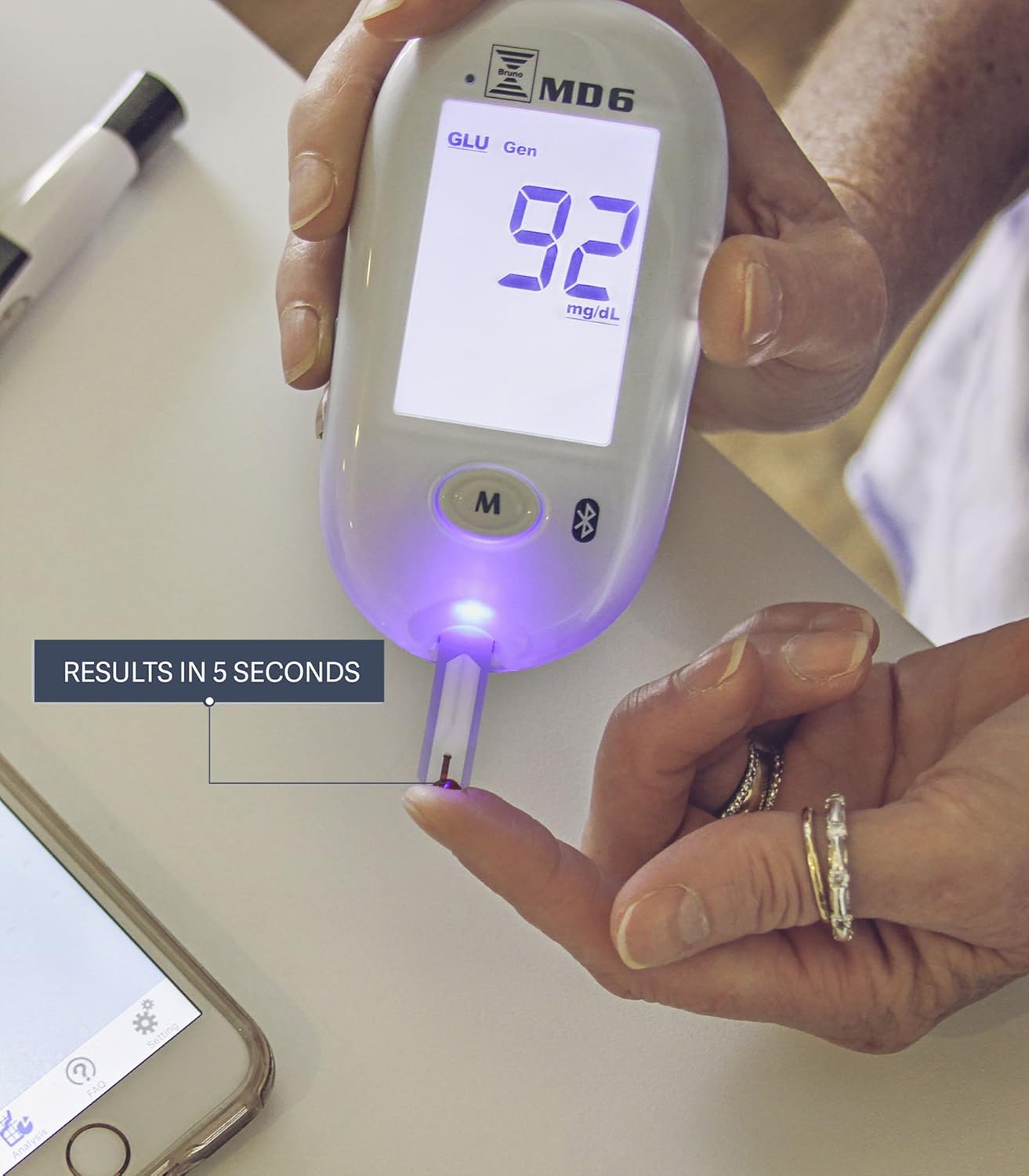 Fast Accurate Readings from the Comfort of Your Home Bruno Pharma Innovations MD6 is a multi-functional diabetes testing kit, built to measure blood sugar and β-ketones and designed to fit your lifestyle in the digital age. No insurance coverage is necessary and no prescriptions or co-pay programs are required. What’s more, the Bruno MD6 may be equal or less than your current out of pocket costs with your current co-pay program.What’s Included in the Bruno MD6 Monitor Kit Bruno MD6 diabetes machine 50-ct box and 10-ct vial of glucose test strips 50-ct box and 10-ct vial of lancets Lancing device 2 free AAA batteries Carrying case Owner’s manual Quick start user guide 5-year warranty cardThe SCIENCE behind Bruno Pharma Easy to use state-of-art blood sugar monitor Lab quality accuracy at home Plasma calibrated test Accurate results in 5 seconds Connects directly to your Smartphone No need for extra cables or adapters Convenient pocket size meter Eliminates the frustration and hassle of keeping logs Wirelessly and automatically maintains a log of your results Stay healthier if your doctor tracks your results Set up automated alerts for your loved ones and physician Share results with your doctor and your loved ones in real timeBruno Pharma MD6 Diabetes Manager App The Bruno MD6 Diabetes Manager app is designed to make busy lives easier to manage. Your MD6 monitor comes with advanced mobile technology, sleek interface design and detailed data management tools to assist you in better diabetes management.