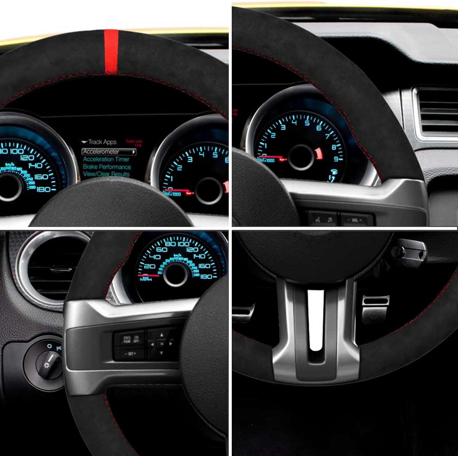 【Material】:【Material】:Crafted from upgraded short plush suede,excellent wear resistance,cold resistance,breathability.Its remarkable durability a soft and comfortable touch,making it both luxurious and fashionable. 【Suitable car model】:Fit for Ford Mustang 2010-2014. Please check the original steering wheel photo,make sure it is the same as your steering wheel.If you are not sure,please feel free to contact us. 【Pros】:Perfect for damaged steering wheel,rubber steering wheel,new steering wheel,steering wheel that wants to change its style. 【Customization】:We also offer personalized customization for your car steering wheel cover.Choose the style,leather color,stripe and thread color (black,white,red,blue,grey,brown,yellow,etc.). 【Package】:1 Steering wheel cover.2 Needles and 1 sew thread.1 Double-sided adhesive.1 Small plastics blade.4 Magic tape.1 Small flat-blade screwdriver. 【Note】:Airbag and steering wheel are not included.The cover need sewing by yourself using thread and needle,need about 1-2 hours.