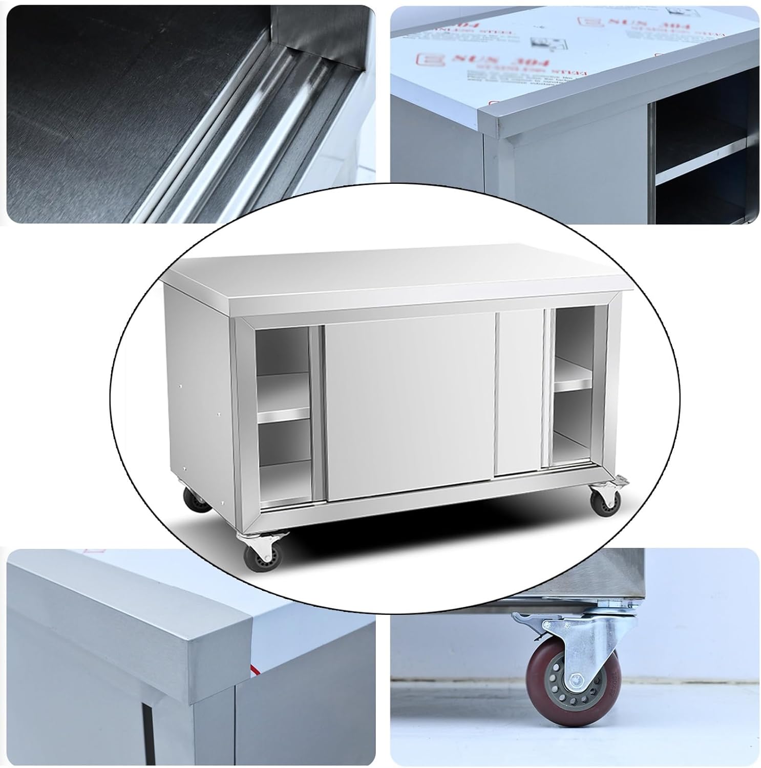 The stainless steel prep table has two sliding doors which keep items while maximising your organisational skills. Lets you easily access and store your gear or supplies while keeping the environment clean and tidy;Mobile worktable with wheels, push and pull smoothly and quietly;Product Name: Kitchen WorkbenchMaterial: stainless steelSize: 80x50x78centimeters(31.5x19.7x30.7")80x60x78centimeters(31.5x23.6x30.7")100x50x78centimeters(39.4x19.7x30.7")100x60x78centimeters(39.4x23.6x30.7")Product list: workbench x1 (other items not included)Attention Tips:1.The product is measured by hand, there may be 1-3centimeters error, please understand.2.Due to different shooting angles and monitors, the picture may have a little colour difference, please understand.