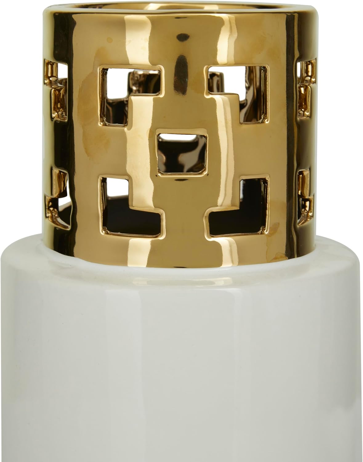 | Additional Features | Geometric cut-out patterns adorn the golden neck of this glossy white cylinder vase |