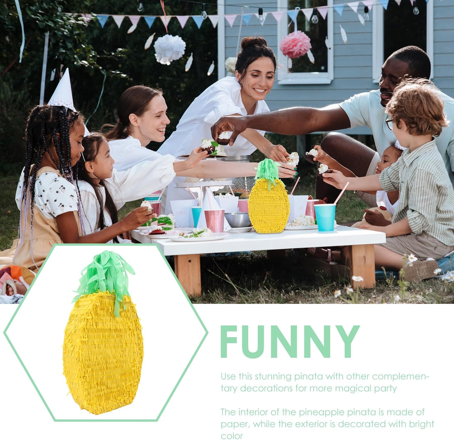 Package Include 1 x Pinata Decor Characteristics -Product Info:Pineapple decoration -Color: Yellow Pinata -Size: Approx. 54.50X30.50X9.50cm / 21.42X11.99X3.73in bridal shower decor -Material: Paper Pinata Decor -Very suitable for playing at holiday parties, birthday parties and festivals or celebrations birthday decorations for women. -The traditional pinata is made into creative shape, which is very in line with the current trend Party Pinata. -Funny and eye-catching design will be a favorite for of all ages and spice up your parties birthday party decorations. -It features lovely shape design, unique and creative, which will greatly attract attention Pineapple Shape Pinata. -This pinata will complete the fiesta, theme party, carnival, birthday party, celebration, and more party ceiling decorations.Goods InformationDecorative Pinata It is perfect for to play on the birthday party, festival, celebration and some other events.Pineapple Shape Pinata It is a creative pinata , which is made of paper material.party birthday decorations Fill some , candy, chocolate, and then hit the pinata with , the will fall down