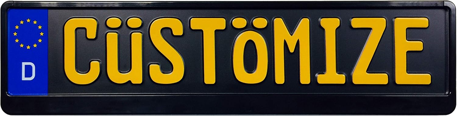 This is an embossed black German license plate made on a 35-ton embossing press.We've added a few extra symbols for fun! Please include the proper spacing and centering you would like on your plate.Custom Black Plate Plate Specifications: Large Text: Up to 8 characters and spaces Medium Text: Up to 9 characters and spacesText Color: WhiteAvailable Letters: A-Z, Uppercase only Available Numbers: 0-9 Available Umlauts: Ä, Ö, Ü Available Characters: #, @, $, ?, !, &, /, =, +, Long Dash -, Period., Apostrophe ', Underscore _, Backwards B Available Symbols: Heart, Smiley Face, Star, Treble Clef See sample pictures for Character and Symbol shape and size. Your plate will have a black background and white text. All plates are stamped and manufactured on German embossing machines. These are not printed. Upon request, we can also include city and year on your plate. Stickers are limited to those currently in stock. Please be specific where you would like the stickers placed. Stickers take one full space. Please include the proper spacing and centering you would like on your plate. The smiley face symbol takes up more than 1 full space. This may reduce available spacing to 7 or 8 characters and spaces. If there are any problems with your requested configuration, we will contact you. Frame Specifications: Length: 20.63 inches Height: 5.18 inches Fits: Most BMW, Audi, VW, Mercedes, Porsche, Mini Cooper, Saab, and more 3 Locking tabs Keeps license plate securely in place Universal fit Premium quality Made in Germany