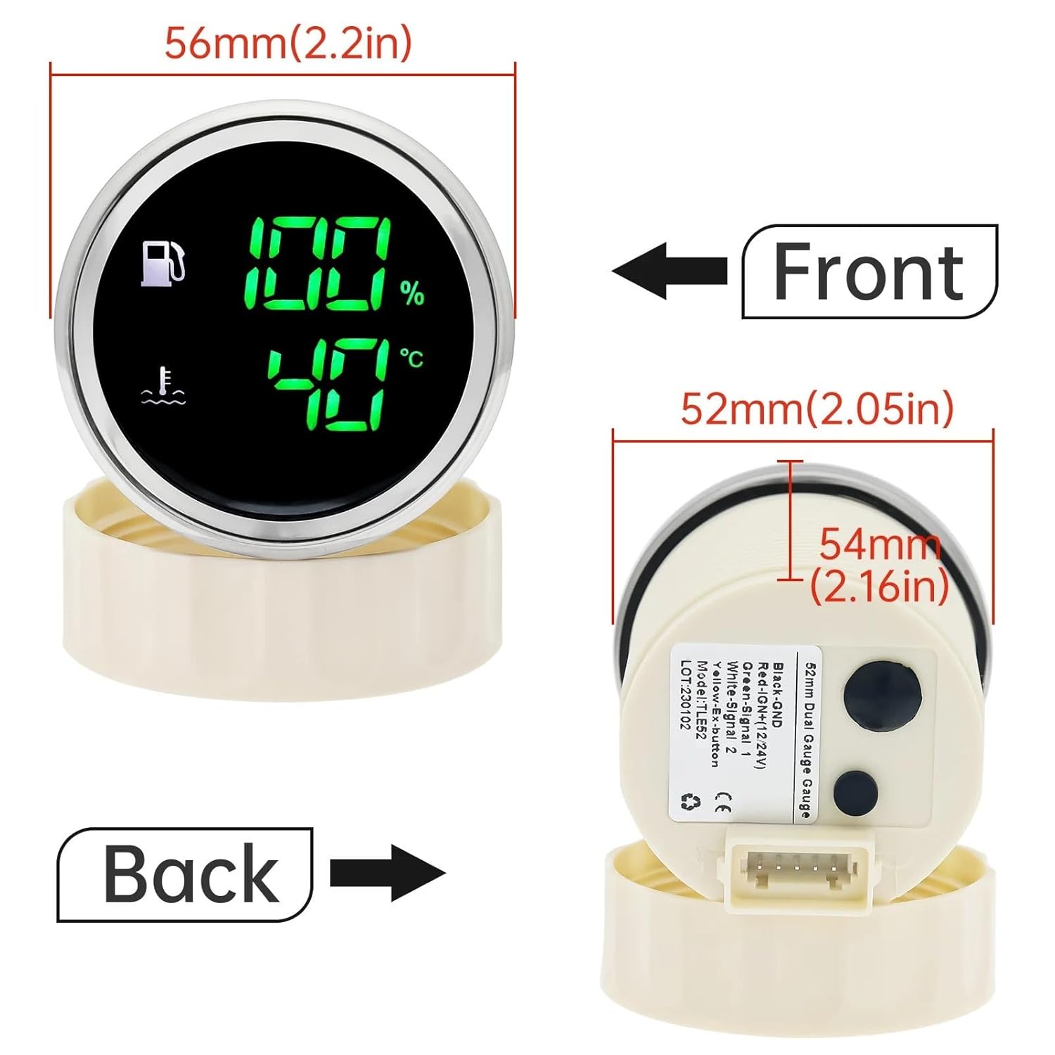 Oil Pressure GaugesWaterproof 52MM Dual Gauge Fuel Level Gauge+Water Temp Meter With Alarm 0-190ohm Fuel Level Sender Unit Temperature Sensors(Optional)PLEASE NOTEWe have three optionsOption 1:1X Temp SensorOption 2:1X 2 IN 1 GaugeOption 3:Gauge + SensorsBefore making the payment, please confirm the product you purchased clearly. The purchase of a single instrument does not include sensors.Option 11X Temp Sensor 10mmOption 21X GaugeOption 31X Gauge1X Fuel Sensor1X Temp SensorAbout the Gauge Reading:The device works, with a little delay (about 20-80 seconds) of changes in the readings. Apparently, it is done in order not to react to the splash of water in the tank.Gauge Connection:black line connect to the negative line,red line connect to the positive line,green line connect to the sensor signal line,yellow line is exchange button lineFeature:- 52mm diameter Two in One Gauge show with easy installation- Programmable Input Resistance Ohm Signal to adapt different fuel /water/temperature sensor0-190, 0-180, 10-180, 240-33, 240-30- High Resolution View under sunshine- Installation Diameter: 52mm (2inch)- Reverse polarity protection and anti-fogging performance- Working Voltage:12V/24V- Working temperatures: - 40 to 85°C- IP66 Waterproof- Fuel Level Gauge Alarm Set:20%-Water Temperature Gauge Alarm Set : 98±2INSTALLATION GUIDE1. Cut an 52mm (2-1/16") hole in the panel (II) allow a clearance of 55mm (2 3/16"). behind the panel.2. Remove fastening ring (I), insert gauge from front. Tighten gauge (III) using fastening ring ( I)3. Connect cables according to the diagram/label.Setting Menu:"Unit" "R 1" "R 2"1.Hold & Press the button Power On Gauge the LED screen will show Switch Show Unit, R1, R2 2.UnitFuel Gauge, Water Level, HTG Sewage Level: %Water temperature: or 3.R1---Configure Top Row Signal Range Press Button to switch 000 ~006For example, LED will show 001, which means 0~180ohm, then release the button and wait digital flash to complete to save setting4.R2---Configure Top Row Signal Range Press Button to switch 000 ~006.For example, LED will show "002" , which means 10~180ohm, then release the button and wait digital flash to complete to save settingBlack shellFuel Level SensorHow to choose the correct length:Sensor length = Fuel tank/Water tank height - 10mmSensor parameter:* Resolution range: 21 mm* Assembly: SAE standard 5 holes* Operating temperatures: - 40 to 85* Rated current for alarm switch: 500mA* Operating temperatures: - 40 to 85 Celsius* Level Sensor fit for Diesel & Gasoline EngineFit for Fuel Level Gauge and Water Level GaugeLiquid level sensor length:100mm,125mm,150mm,200mm,250mm300 mm ,350 mm ,400mm,and so on* Mounting: 5 pieces of M5 screws and 2 mm thick gasket* Output signal: 0~190 ohm (Standard European), 240~33 ohm (Standard American)Snesor Package Includes:1 x Sensor1 x Gasket5 x Screws==========High-concerned chemical : NoneOther Part Number : fuel level gaugePlacement on Vehicle : FrontInterchange Part Number : Mini Digital Fuel Meter Motorcycle GaugeSpecial Features : 0-190ohm/240-33ohm Fuel Level MeterItem Weight : 0.4kgItem Height : 0Item Width : 52mmItem Length : 52mm Boat Water Tank Level Gauge Part Number : Auto Digital Fuel Level Gauge NO. : Fuel level gaugeMaterial : stainless steel 316L bezel+anti-fog glassItem name : Custom 2 In 1 Dual 52mm Fuel Level Temp GaugeInput signal : 0~190ohmType : Fuel Gauges for Auto Boatfeature : Auto Digital Fuel Level Gaugeboat car fuel gauge : fuel level sensorApplication : Car Fuel Gauge for car truck yachtfuel gauge sending sensor : fit Fuel Level Meterfuel gauge sending sensor support : Water Liquid Level Gauge MeterWater Liquid Meter : Car Boat Water Tank Level GaugeFuel Sending Unit : fit for Water Level Gauge Fuel level gaugewater level sensor : 100mm~550mmAssembly : SAE Standard 5 Holes5 Holes Sensor Support : Fuel Level Gauge, Water Level GaugeLEVEL SENSOR : boat fuel gaugewater level : fuel level sensor(Optional)Water Temp Sensor : 10mm(Optional)Water temp gauge : Temperature Sensorwater temp sensor : 301-23ohm
