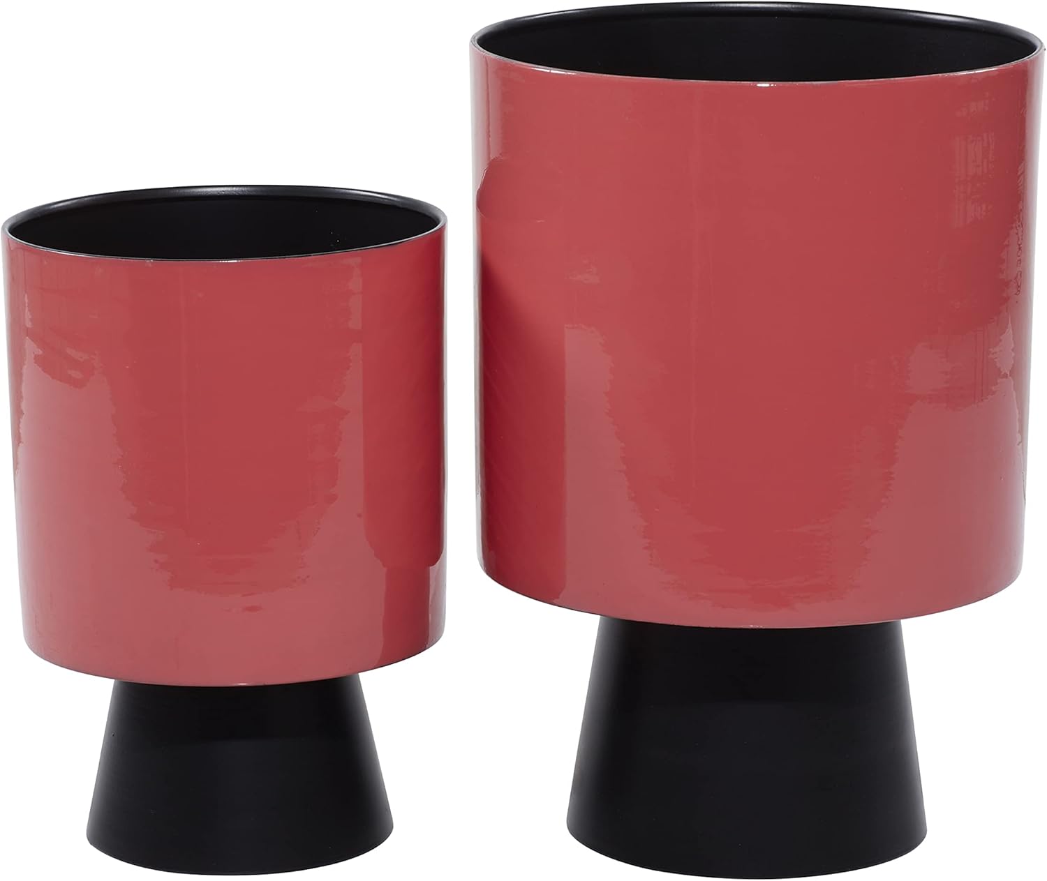 Use the variation in pot size and depth and stand height of this 2-in-1 set of red indoor planters to furnish eclectic interiors. Completely iron, no-drainage hole pots, and suction-like bases make up the solid construction to not disturb the calmness in the corner of your living space. Pots can be used as planters or as accent pieces together or separately. Add bundles of charm and tranquility to your home by displaying this planter set in your modern-styled home Wipe clean with a dry cloth. Stands balance on suction-like bases. Suitable for indoor and outdoor use. Made in India. Pots do not have drainage holes. These red indoor planters from India come as a set of 2. Modern design. This item comes shipped in one carton.