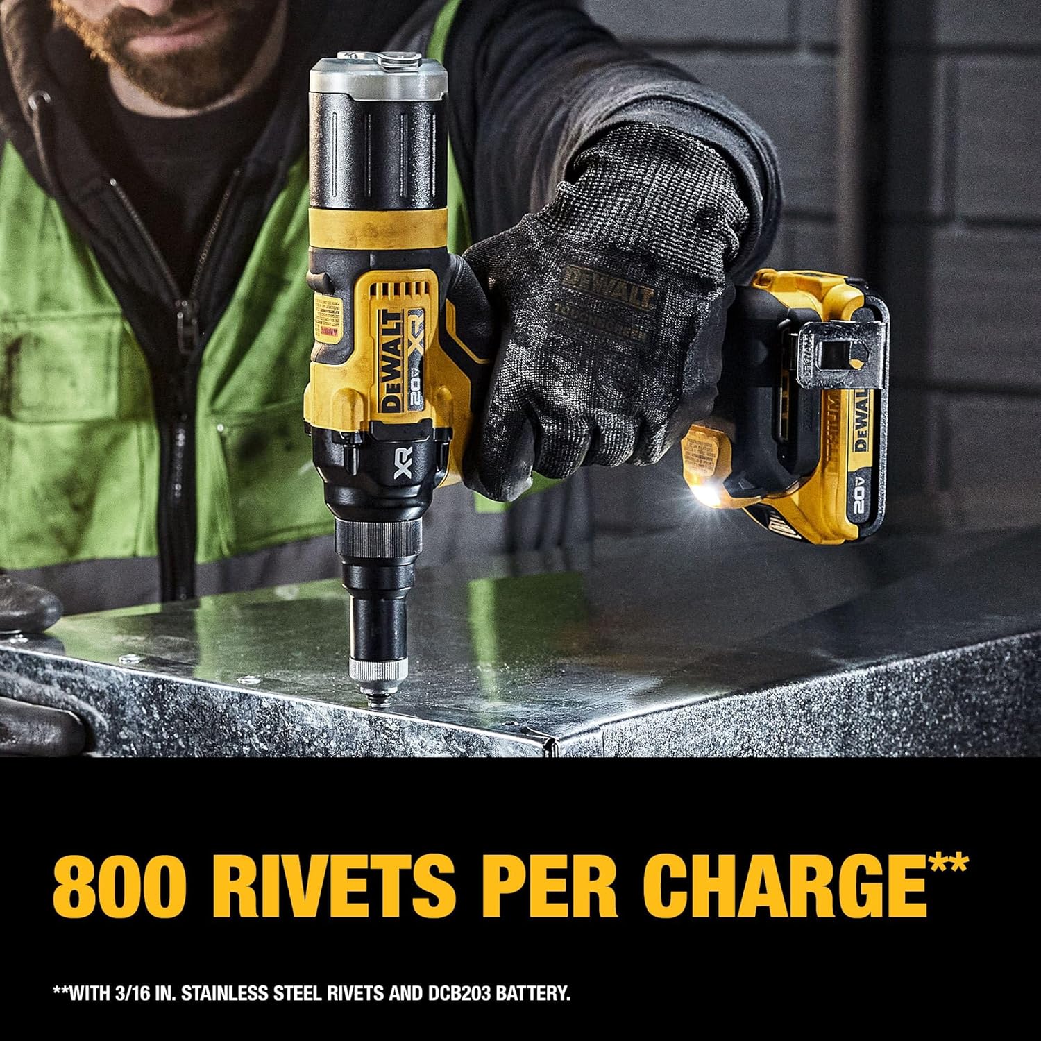 The 20V MAX* XR Brushless Cordless 3/16" Rivet Tool is lightweight yet powerful with a brushless motor that delivers up to 2,100 lbf of pulling force (using DCB203 battery, sold separately) for installing aluminum, steel, and stainless steel blind rivets up to 3/16". With the capability to pull 800 rivets per charge**, in addition to a tool-free nose piece change and on-board nose piece storage, this cordless rivet tool maximizes productivity on the jobsite.