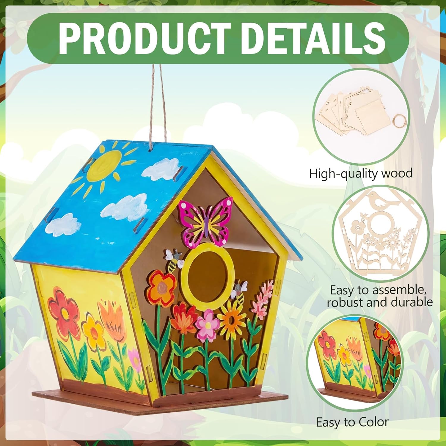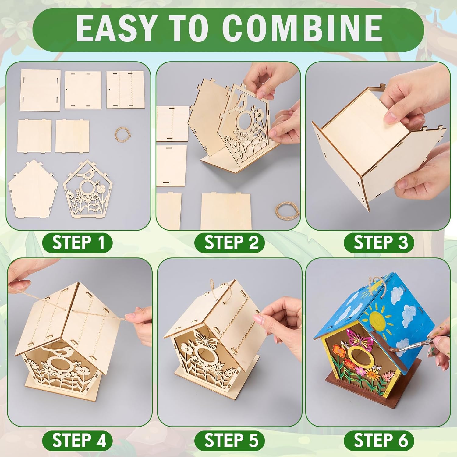 Features: Unfinished wooden houses for crafts are designed with hanging ropes, so they can be displayed in various settings, from outdoor garden spaces to indoor living areas. This versatility allows little ones to showcase their artistic creations in different environments These DIY birdhouse kits allow people to customize with paint, stickers, or markers, a fun craft activity for birthdays, return gifts, and seasonal decorations Specifications: Material: wooden Color: wood color Size: 11 × 10 x 14 cm Package includes: 24 x Wooden Bird Houses Painting Craft Kit Notes: Manual measurement, please allow slight errors on size. The color may exist a slight difference due to different screen displays