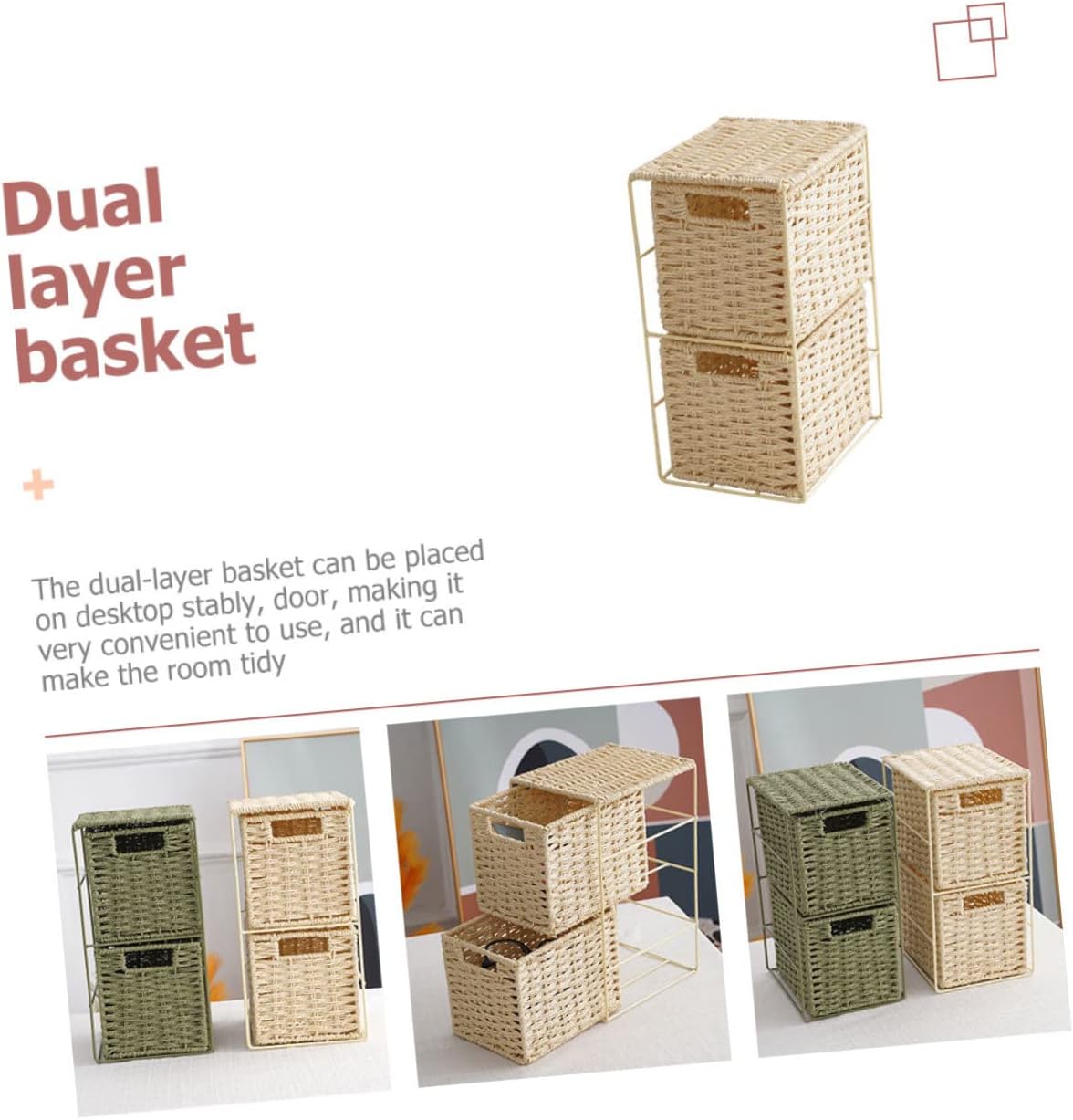 Package Include 2 x baskets 1 Characteristics -Color: Khaki basket multi-purpose -Size: About 32.00X20.00X16.00cm/12.58X7.86X6.29inch Sundries Basket -Material: PVC, iron bathroom accessories countertop - Fine weaving, choose natural growing materials, through the craftsmen tightly woven master, good air permeability woven storage bins. - This storage container is made of , which has a Dual-layer Sundries Basket. - You can collect and store various items such as cosmetics, glasses, notebooks, socks and other small objects imitation rattan storage basket. - The container comes with simple structure, making it very easy to fix and use multipurpose basket. - With a simple and stylish design, it will not affect the beauty of the home drawer container.Goods Informationkitchen organizer Beautifully design will ensure its popularity and practicability.Simulated Rattan Sundries Container This product is different from other storage container, made of , the woven basket can be displayed in your home or store