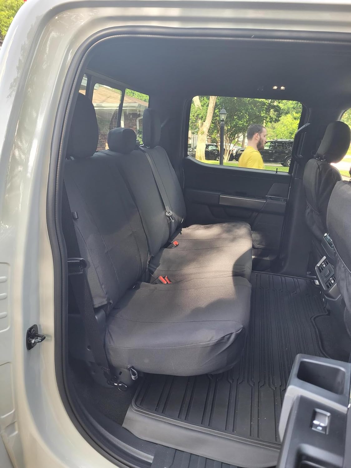 *Please note: Product being sold is in SOLID BLACK ENDURA. Entire seat cover set is accurate to color of swatch photo, and to first picture. Other photos are our seat covers in different colors to display seat cover style and fit but are in SOLID BLACK ENDURA.* Every detail matters, READ THE DETAILS AND COMPARE TO YOUR SEATS Durafit car seat cover for Ford F150-F550 Super Cab/Crew front seat cover and back seat cover are made to fit your seats perfectly. This model fits the 2019 -2025Ford F150-F550 Super Cab/Crew models. So front seats are 2 buckets with NO center seating. Ford waterproof seat covers have Front bucket seats with Adjustable HR (Manual Or Electric Seats), with Side Impact Airbags in the Seat. The Rear seats are 60/40 Split Bench with Adjustable HR. (No Armrest, Does not fit the back seat with an armrest. Your back seats should have side tabs to release seat bases.) The Ford seat covers full set come in a beautiful Black Endura fabric. Endura seat covers are made out of tightly-woven material, highly durable polyester making it a heavy-duty car cover seat,water resistant, pet-proof, and work truck ready. Note: To install back seats, the backrests can be folded down by pulling a tab on the passenger side. For the driver's side, tilt the base up and look down behind the seat, then push down on the latch to disconnect. Durafit Seat Covers: truck seat covers for ford f150, f250 seat covers, ford f350 seat covers, ford f450 waterproof seat cover, ford f550 vehicle seat covers