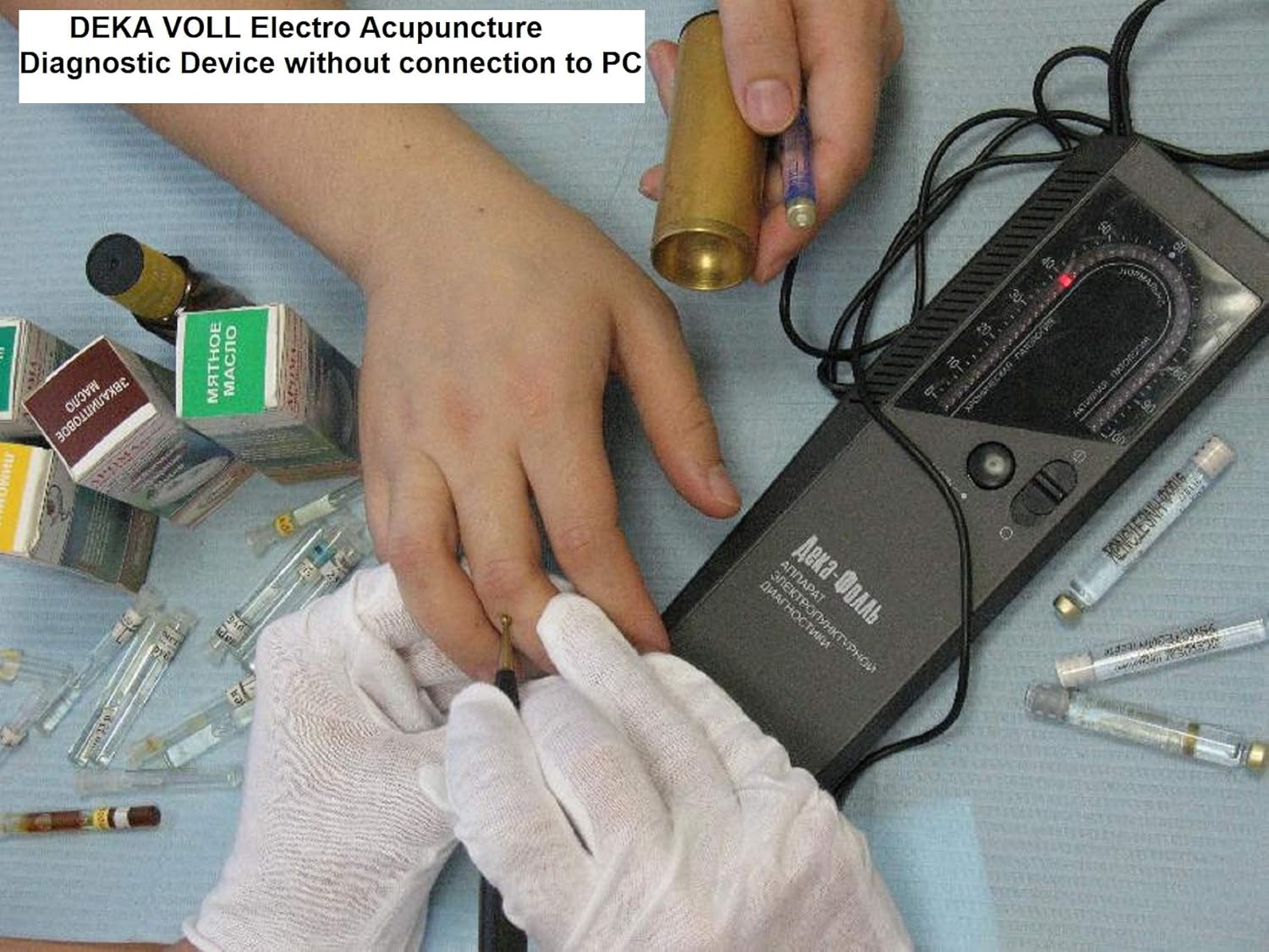 We offer you an updated version of the device Deka Voll. 1. The buttons have been changed to touch buttons and, as a result, there are changes in the switching order - to turn on the device, just touch the button with the probe. 2. The device turns off only automatically - two minutes after finishing work. The device is designed for diagnostics and evaluation of a patient’s condition, for selection of medicines and adjustment of drug dosage on the basis of the electropunctural diagnostics according to the method of Doctor R. Foll. This method combines elements of Chinese theory about acupuncture and modern electronics potential. It is compact, cheap compared to analogues, which allows providing significant number of doctors of different specialties with such devices. Advantage of the method is the possibility to test allopathic and homeopathic drugs with adjustment of drug dosage, cosmetics, adornments of different metals, medicative herbs, metals for dentoprosthetic rehabilitation and filling material etc. without solution of continuity of skin integument and mucosa, and to forecast effectiveness of every individual drug for a particular patient. Medical testing with R. Voll method allows you to: significantly reduce the time of examination; increase diagnostic accuracy and decrease laboriousness; make early diagnosis at the stage of pre-clinical manifestations; identify existing disorders in various organs and systems of the patient (acute, sub-acute, chronic, degenerative, neoplastic processes); identify pathogens and toxins; indicate sensitivity of micro-flora to medicines; implement a focused selection of physiologically adequate medication for treatment of patients taking into account their individual tolerance; identify pathogenetic mechanisms. test different medications on compatibility to each patient; detect presence or absence of radionuclides in the body; choose an optimal diet for a patient; determine presence or absence of adverse effects in a variety of household items: jewelry, cosmetics, clothing; optimize the course of treatment in polyclinics, inpatient and sanatorium-resort establishments.