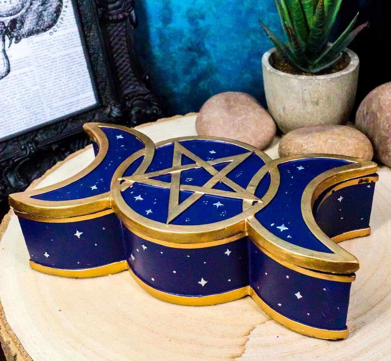 This all in one triple goddess decorative box captures the very concept of this Wiccan belief. Store your jewelry, paper clips, secret stash or what have you! This Triple Goddess Sacred Moon Decorative Box measures 1.75" tall, 6.25" long and 3" deep approximately. It weighs about 13 ounces.