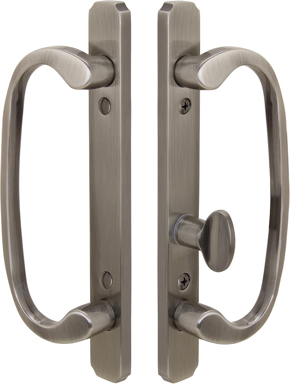 This very high quality handle set will fit most wood, vinyl, and aluminum sliding glass doors on the market. Please see handle dimension photo to insure fitment. Handle mounting holes are spaced 3-15/16” center-to-center. Thumb turn is in offset position. Handles project 1-3/4” from door face allowing good finger and screen door clearance.