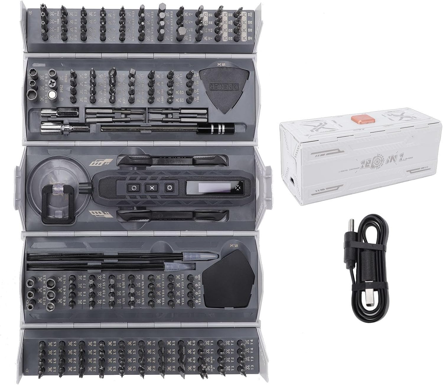 [Extended Design] The included detachable extension pole transforms the for hard to areas allowing you to work in deep holes or tight spaces with ease. the magnetic bit holder keeps screws secure while the ergonomic handle provides comfortable grip and precise control during extended repair sessions. [Versatile Torque Control] The electric features three torque settings (0.2nm 0.28nm 0.4nm) plus a powerful manual mode (3nm) giving you complete control for delicate electronics like phones and laptops or tougher jobs like computers and appliances. the adjustable torque prevents damage to sensitive components while providing enough power for stubborn screws. [Smart Organized Storage] The durable 5 fold with custom slots keeps all 180 bits and accessories neatly organized and easily accessible. the compact design protects your investment while making it simple to find the exact bit you need quickly saving valuable time during repairs. everything stores securely for portability to any job site. [Comprehensive 180 in 1 Set] This professional kit includes 158 crv steel bits 4 extended s2 steel bits plus 8 essential tools (hole opener anti static tweezers pry bars extension pole suction cup) covering virtually all repair needs. the premium steel construction ensures durability while the extensive selection means you'll always have the right bit for any job. [Long Lasting Reable] Powered by a 500mah lithium battery that tightens up to 260 screws per this electric features modern type c charging and clear power indicators. the efficient motor delivers 170rpm performance with 100 120 minutes continuous runtime and 3 6 month standby time for always ready convenience. Spec: Item Type: Electric Set Material: CRV, S2 Steel, ABS, TPE, Stainless Steel Model: JM-8193 Handle Battery: 500mAh Li Battery x 1 (Built in) Speed: 170rpm Working Time: 100-120 Minutes Charging Time: About 100 Minutes Standby Time: 3-6