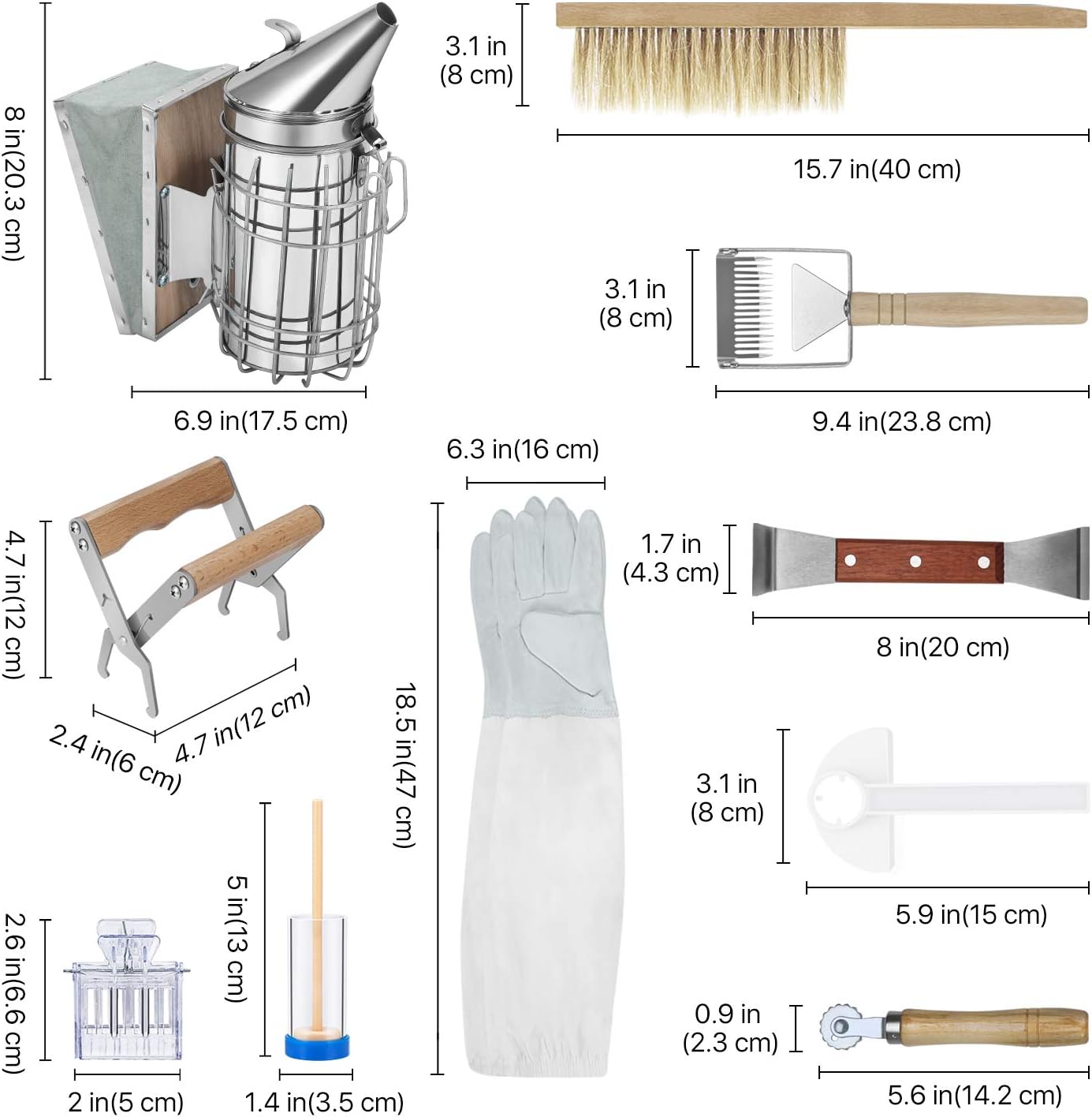 The Flexzion Beekeeping Supplies Tool Kit is a comprehensive 10-piece set designed for beginners and hobbyists alike, providing essential beekeeper equipment for safe and efficient hive management. This all-in-one bee keeper kit includes a smoker for bees, durable gloves, a frame holder, a bee brush, a double-sided uncapping scrapper, a fork, a queen clip cage, a marking tube, an entrance feeder, and a frame embedder. Each tool is crafted from high-quality materials to withstand frequent use, helping new beekeepers handle hive inspections, honey extraction, and queen management with ease and confidenceSpecification:Beekeeping Supplies 10 Pcs Starter Kit Professional Equipment Beekeeper Tool Kitincludes:Shielded Stainless Steel Bee SmokerBeehive Frame HolderPair of Beekeeping GlovesBee BrushDouble Side Uncapping Scrapper HookUncapping ForkQueen Bee Clip CageQueen Bee Marking TubeEntrance Water FeederHive Frame EmbedderPackage Content:1x Shielded Stainless Steel Bee Smoker1x Beehive Frame Holder1x Pair of Beekeeping Gloves1x Bee Brush1x Double Side Uncapping Scrapper Hook1x Uncapping Fork1x Queen Bee Clip Cage1x Queen Bee Marking Tube1x Entrance Water Feeder1x Hive Frame Embedder