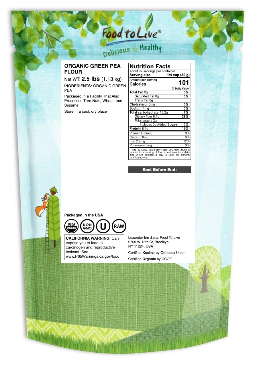 So, what is Pea Flour? Let us introduce Food to Live’s Vegan, 100% Raw, Non-GMO, and Organic Peas Flour produced by grinding dried Organic Green Peas into a fine texture. This flour has a light-green color and a neutral somewhat nutty taste which works wonders in a variety of recipes. How to use Organic Green Pea Flour? Organic Pea Flour aka Organic Pea Powder is a super versatile ingredient that will come in handy at any kitchen. Green Peas Flour serves as a wonderful substitute for Wheat, All-purpose, Rye, and Barley flours. Use it for your baked goodies: muffins, cakes, cookies, crackers, breadsticks and flatbreads; as a thickener for soups, stews, gravies, and sauces; or as a crunchy coating for your fried veggies, fish, and meat. Apart from that, Green Pea Flour Organic can be used for cooking pancakes, home-made pasta, pizza crusts and tortillas. At Food to Live, you may pay less per unit by buying Organic Pea Flour Bulk bag. Considering its pretty long shelf life, this Flour will be a great pantry staple. Organic Pea Flour Nutritional Profile Powdered Organic Peas are highly nutritious and will be an amazing part of a balanced diet. Green peas flour is an ideal choice for those looking to boost their protein intake, as it contains up to three times more protein than traditional wheat flour (that’s why it is sometimes sold as Pea Protein Powder). In addition, this flour is rich in dietary fiber but relatively low in carbs which makes it Keto-friendly. Organic Green Pea Flour is also a great source of various Vitamins and essential minerals including Vitamins C, A, Iron, Manganese, Folate, Thiamine, and Phosphorus. Storage Tips To ensure your Organic Green Peas Flour stays fresh, keep it in an air-tight container in a cool dry place away from direct sunlight. If you buy bulk Organic Pea Protein Powder to store it long-term, we advise putting it in a fridge.