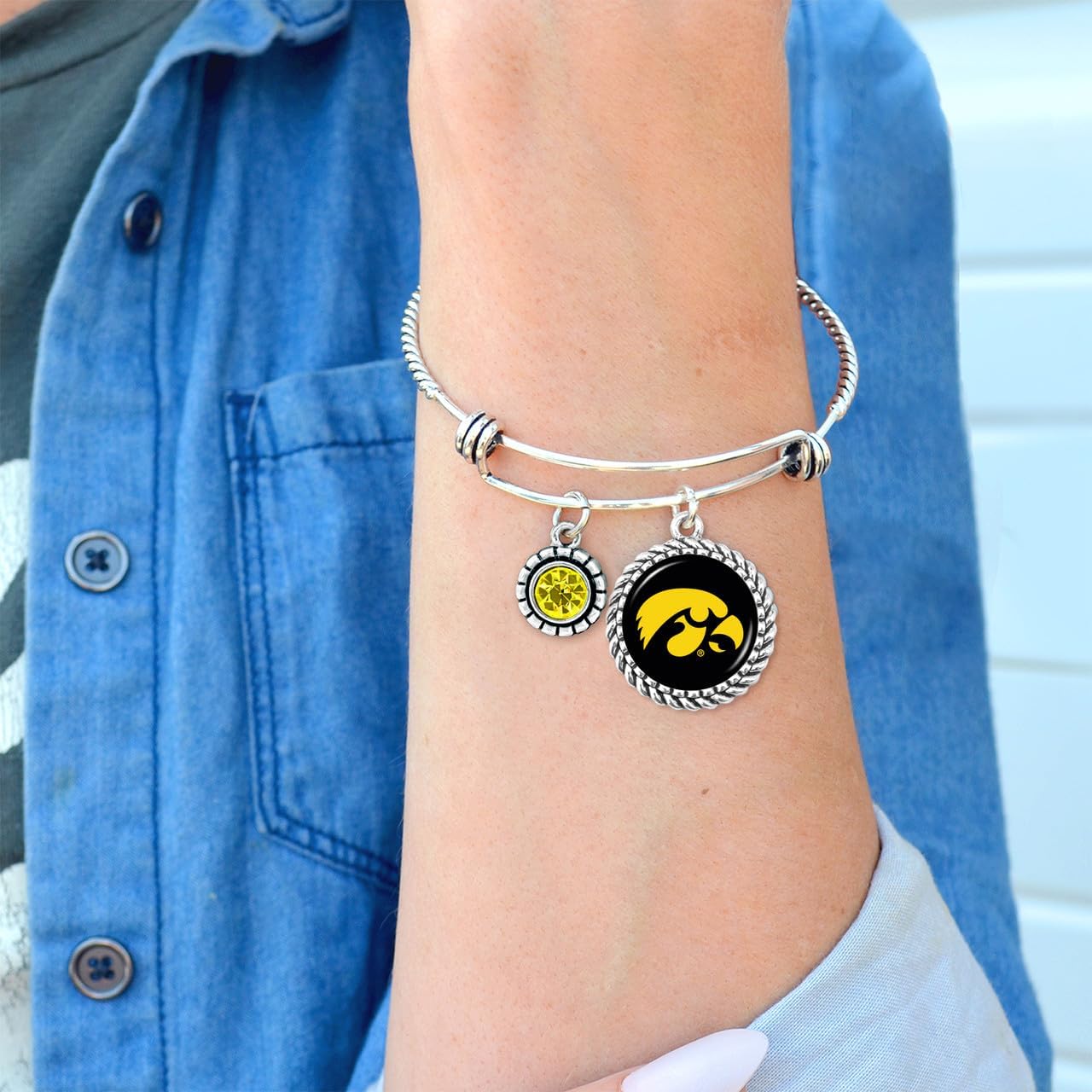 Officially Licensed Collegiate Nameplate Bracelet. Perfect for game day or wearing around town! 7.5" Twisted Wire Bracelet. Team Logo Charm Size-1” Diameter. Equivalent to a Quarter. Accent Color Crystal Charm-0.5” Diameter.