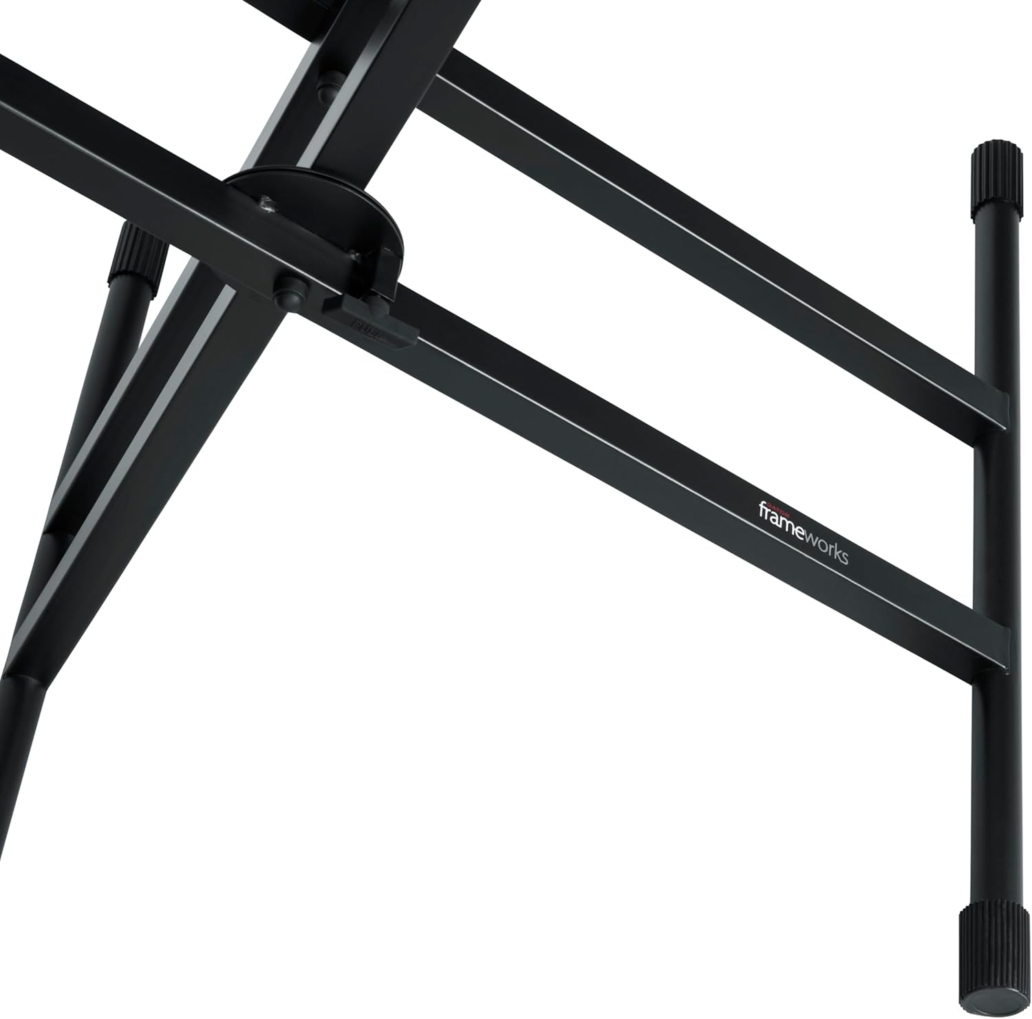 Gator Frameworks heavy duty 2 tier "x" style keyboard stand with rubberized leveling Foot. Heavy duty steel construction with a double Braced design provides a stable and secure stand for any keyboard up to 175lbs. An adjustable top tier allows for an additional keyboard to be used.