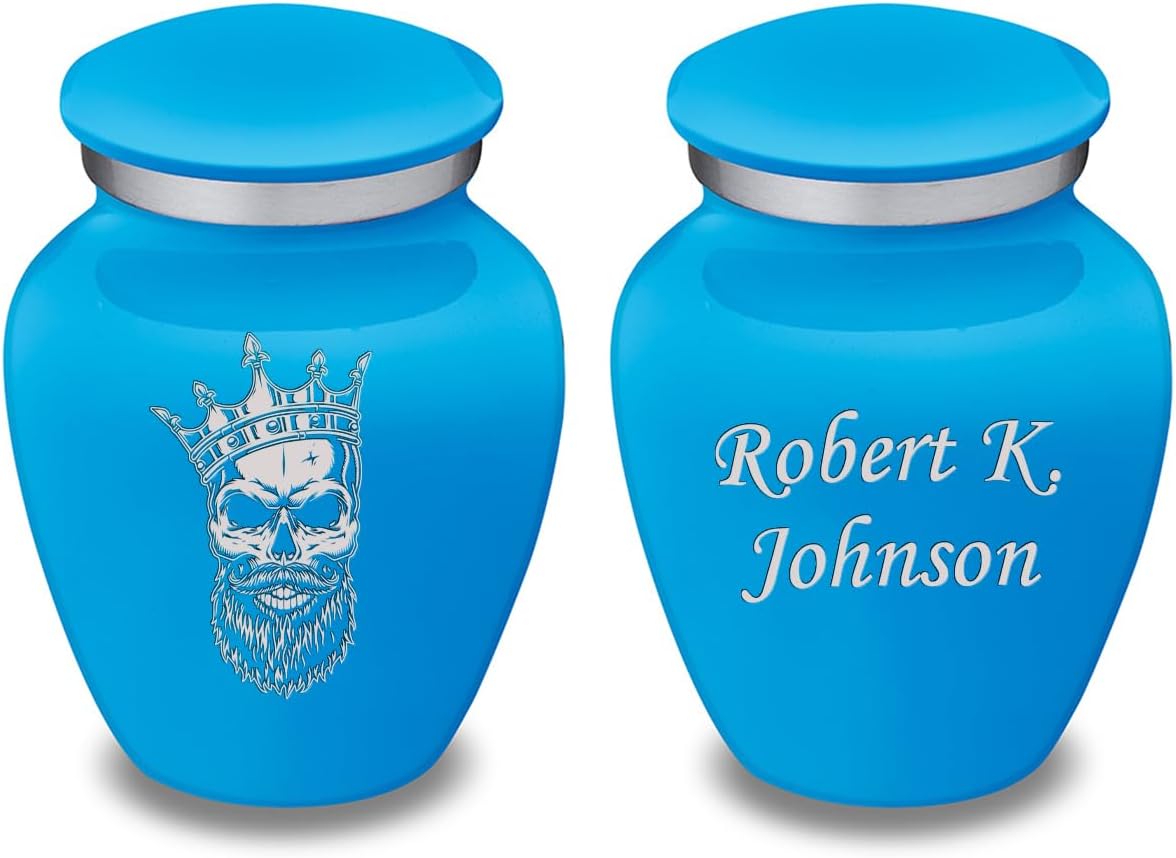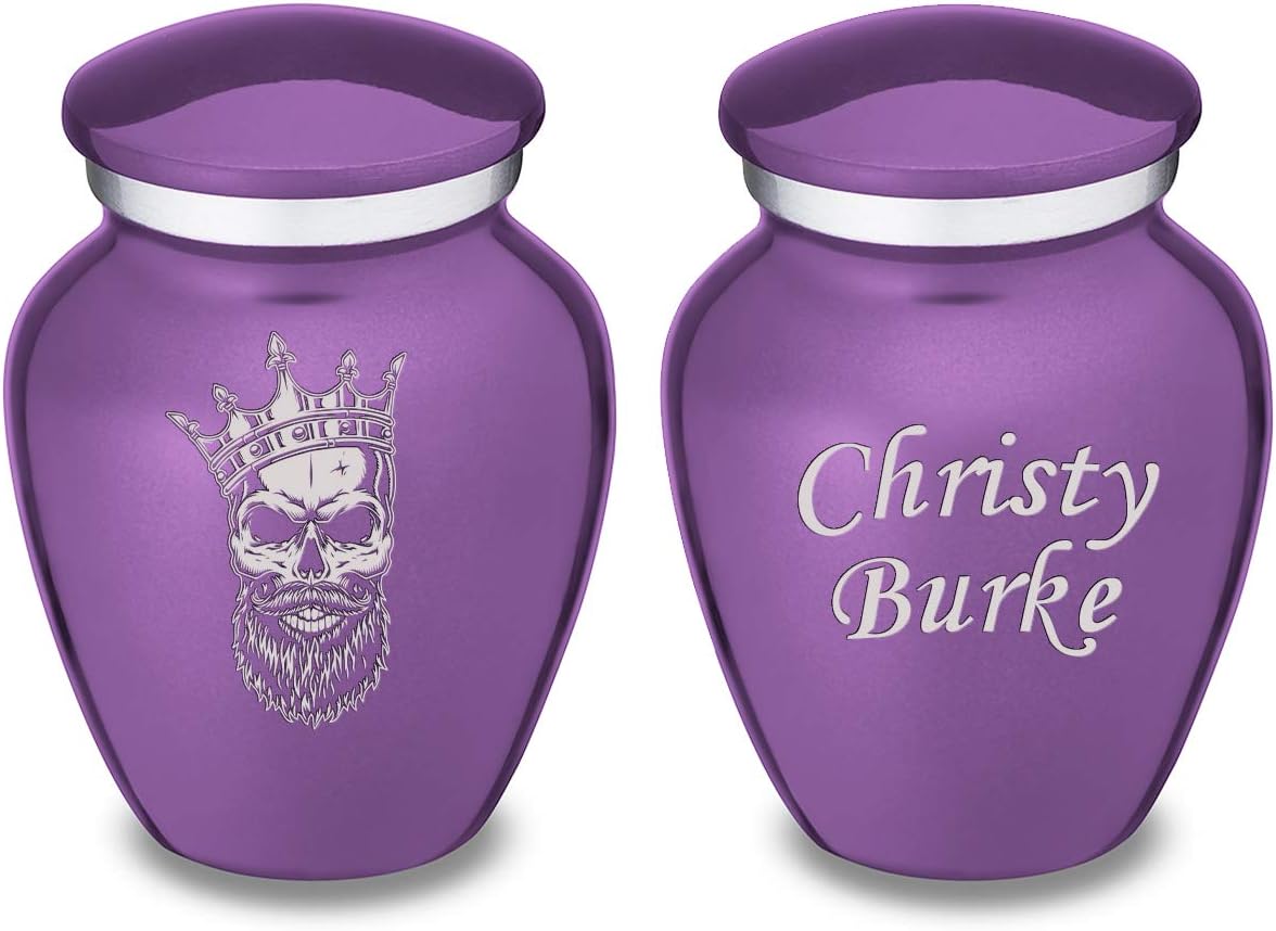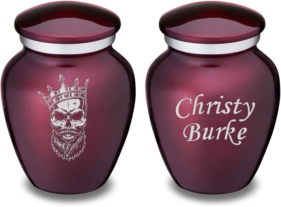 Honor the memory of your loved one with the Embrace Skull Cremation Urn for Ashes. This beautiful urn displays a dramatic bearded skull with an ornate crown. This is the perfect resting place to immortalize someone who had a fighting spirit and who was unapologetically themselves. This gorgeous urn also has the option available for custom engraving to offer personalized tribute. Type up to three lines of text with any of our available fonts. Note: all custom engraved text is final and will be engraved as submitted. Keepsake Embrace Urns are simple yet elegant in their design; drawing from the classic urn combined with modern motifs. A Keepsake Embrace Urn is 3.5 Cu Inches (appropriate for sharing). Size: Keepsake Small Urns Dimensions: 3"H x 2.25"D Capacity: 3.5 cu. Inches Material: Alloy Opening: Threaded lid Velvet Bag: Not Included