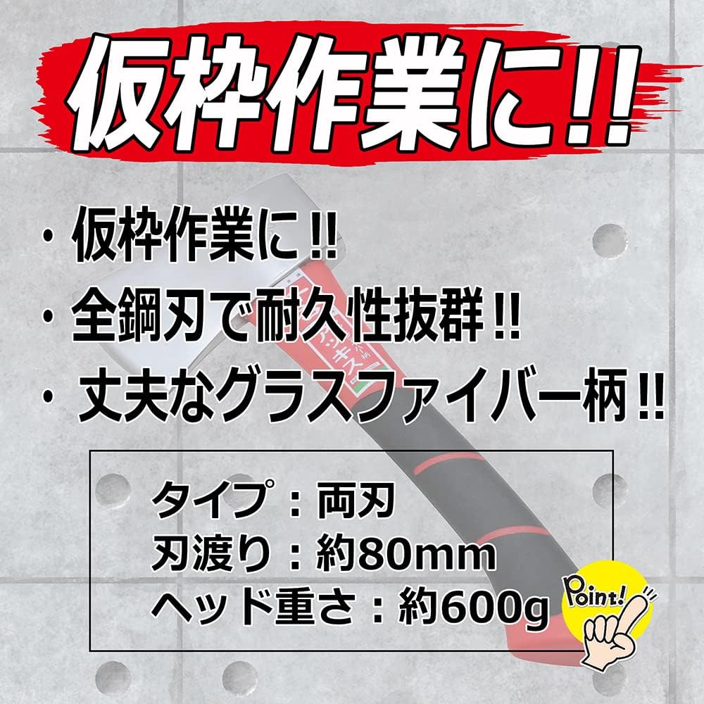 [Use] Axe. [Features, Functions] It is great for frame work. Durable glass fiber handle. Excellent durability with all steel blades. [Precautions] Please do not use it other than the original use. Please confirm that there is no rattling / slack in the main body or parts before use. Please wear protective glasses, gloves etc. when using. Please clean after use and keep it in a safe place out of reach of children. Senkichi is one of eight original brands of Fujiwara Sangyo Co., Ltd., specialized in cutting tool for carpentry and gardening. "Providing products to all tool distribution channels in Japan." Established in April 17, 1944, the company business is carried out from the headquarters and seven branches and sales offices. [Products] Carpenterfs tools/Work tools/Air tools/Tip tools/ Work support/Gardening tools/Gardening equipment/Gardening supplies. [Product Categories] A wide range of products, from carpentry and power tools, to hand and gardening tools. As a trading firm focused on planning and development, we offer a variety of DIY tools, primarily power tools, hand tools, and gardening tools. Our product line includes approximately 100,000 models. This vast array of products allows us to satisfy the needs of our clients. [Carpenterfs tools] Basic DIY tools for cutting, grinding, hammering, polishing, and measuring. [Work tools] Hand tools for any work situation and application. [Air tools] Power tools that efficiently perform high-precision work. [Tip tools] Tool bits with high precision that can be safely used with any material [Work support] Product support for safe, secure, and comfortable work performance. [Gardening] Gardening equipment for hobby gardeners and professionals. [Gardening equipment] Wide range of products for pruning, cutting, planting, weeding, cultivating, and storing. [Gardening supplies] Gardening tools for various gardening applications.
