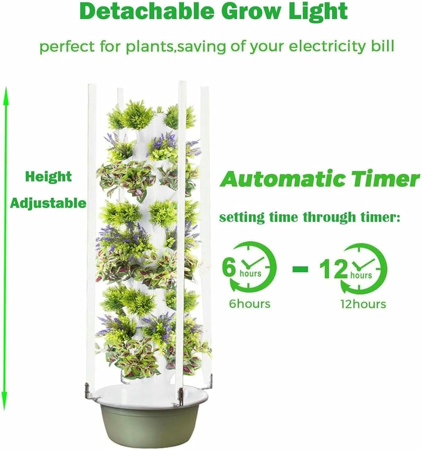 Our indoor tower garden hydroponic planting sys-tem is designed to provide high productivity and ease of use, with an emphasis on improving practical functionality. The vertical sys-tem uses aerial technology, which greatly increases the oxygen flow in the root zone and promotes the growth of plants.Specifications:Product Name: Hydroponics Growing Sys-tem TowerMaterial: ABSNumber of Layers: 5/7/9Water Pump Power: 10/16/25WPlanting Holes: 20/28/36LED Light Power: 64/80/96WDimensions:5 Layers: 53X105cm7 Layers: 53X134cm9 Layers: 53X163cmWeight: 7.5/8.6/9.8KGPacking List :1 X Hydroponics Growing Tower4 X LED Lightare honored to provide you with satisfactory service.