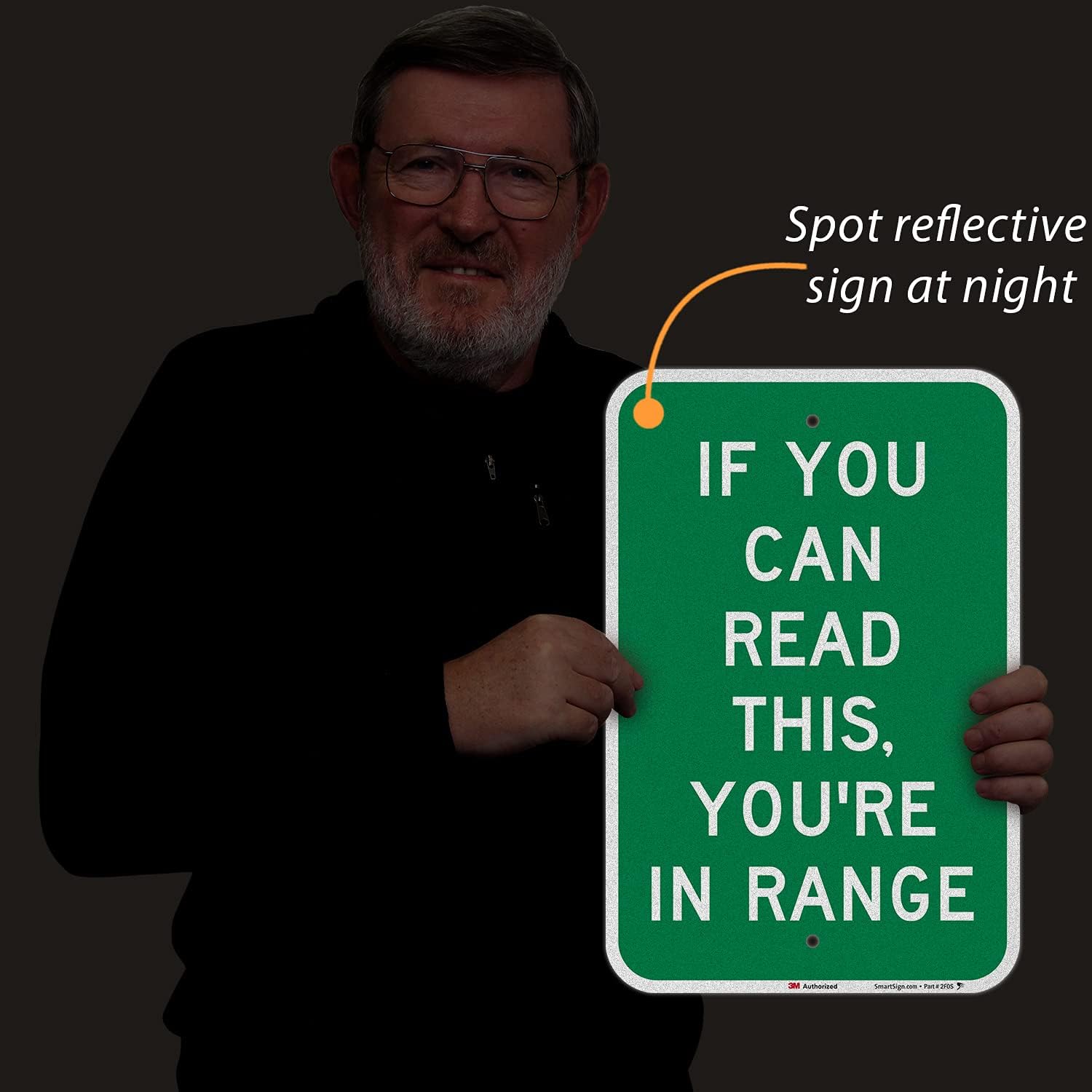 My Security Sign engineer grade reflective aluminum rectangle shooting range warning sign, legend "IF YOU CAN READ THIS, YOU'RE IN RANGE". Signs are reflective and reflect headlights. This is most common traffic sign and parking sign material. Most parking lots now require reflective signs; non-reflective signs are not allowed under MUTCD standards. Signs carry the 3M warranty for traffic signs - signs are guaranteed to last at least 10 plus years outdoors. Signs are printed with 3M screen printing or 3M outdoor digital inks designed specifically for outdoor traffic and parking signs. Unlike competitive signs, these signs are proven to last outside and use 3M matching ink and film components throughout. Municipal-grade signs are used by countless agencies, governments and schools across the US. Sheeting meets the standard DOT specifications for construction of Roads and Bridges on Federal Highway Projects FP-85 for Sheeting Type II, Class 1 or 2 and the GSA LS-300C Class 1 or 2. The base material for these signs is a 63 mil thick non-rusting aluminum. Signs have rounded corners - for easy handling and a professional appearance. Competitive signs often use a lower cost and more hazardous square corner. Signs have prepunched/precleared holes to insure a hassle-free installation. 63 mil thick signs outlast wind and abuse. Once installed, and unlike 40 mil aluminum signs, they are virtually impossible to bend. In a workplace setting, reflective aluminum signs are also used for emergency shut-offs, exits and evacuation marking. It has great water and chemical resistance. Sign lasts 10 plus years outdoor life. Great water and chemical resistance. Typical maximum temperature 168 degree F. Mounts with screw or clips. Measures 12-inches width by 18-inches height. White on green color combination.
