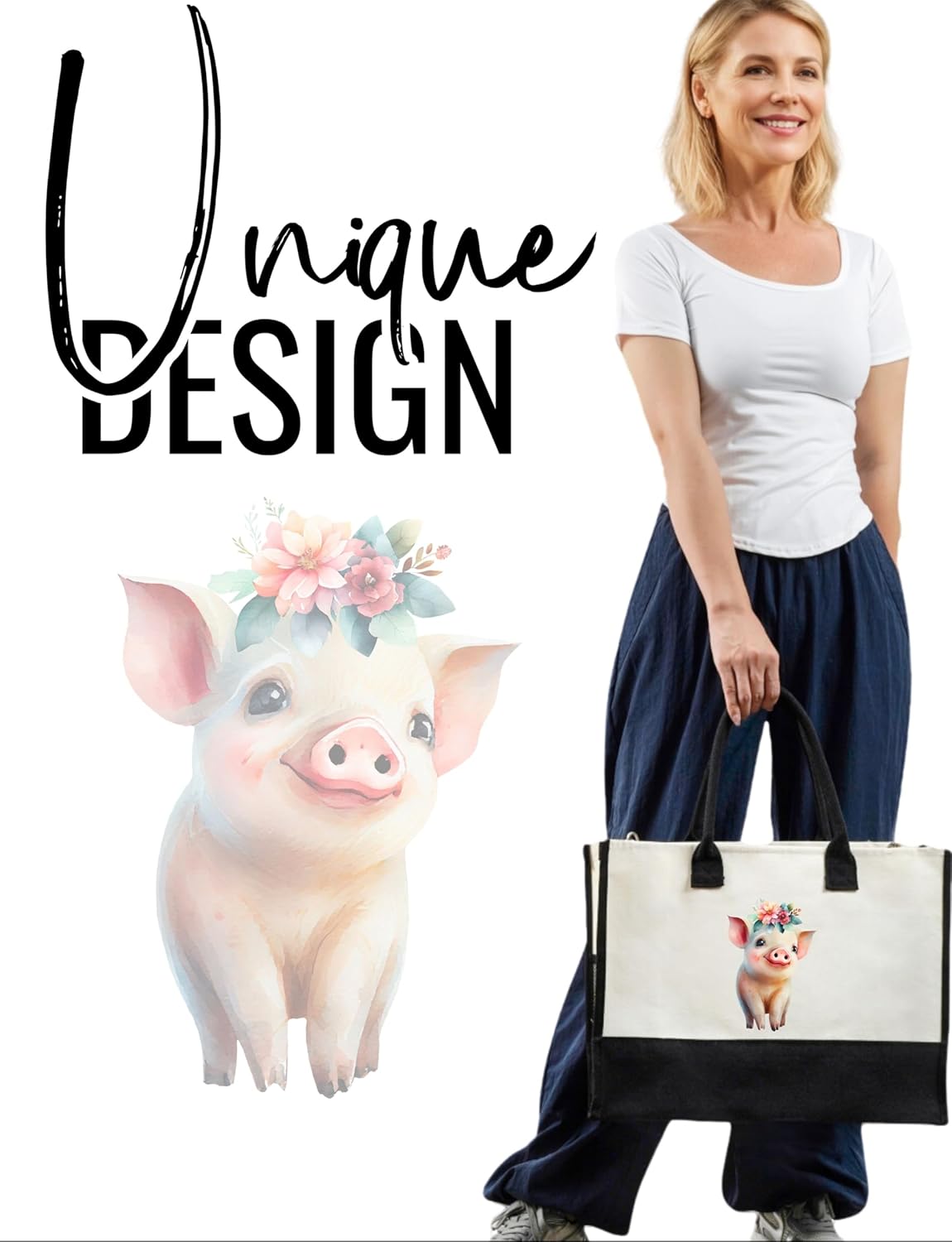 InnoBeta Pig Gifts for Women Canvas Tote Bag, Pig Gifts Tote with Top Zipper Closure and Shoulder Strap for Birthday, Mother's Day, Christmas