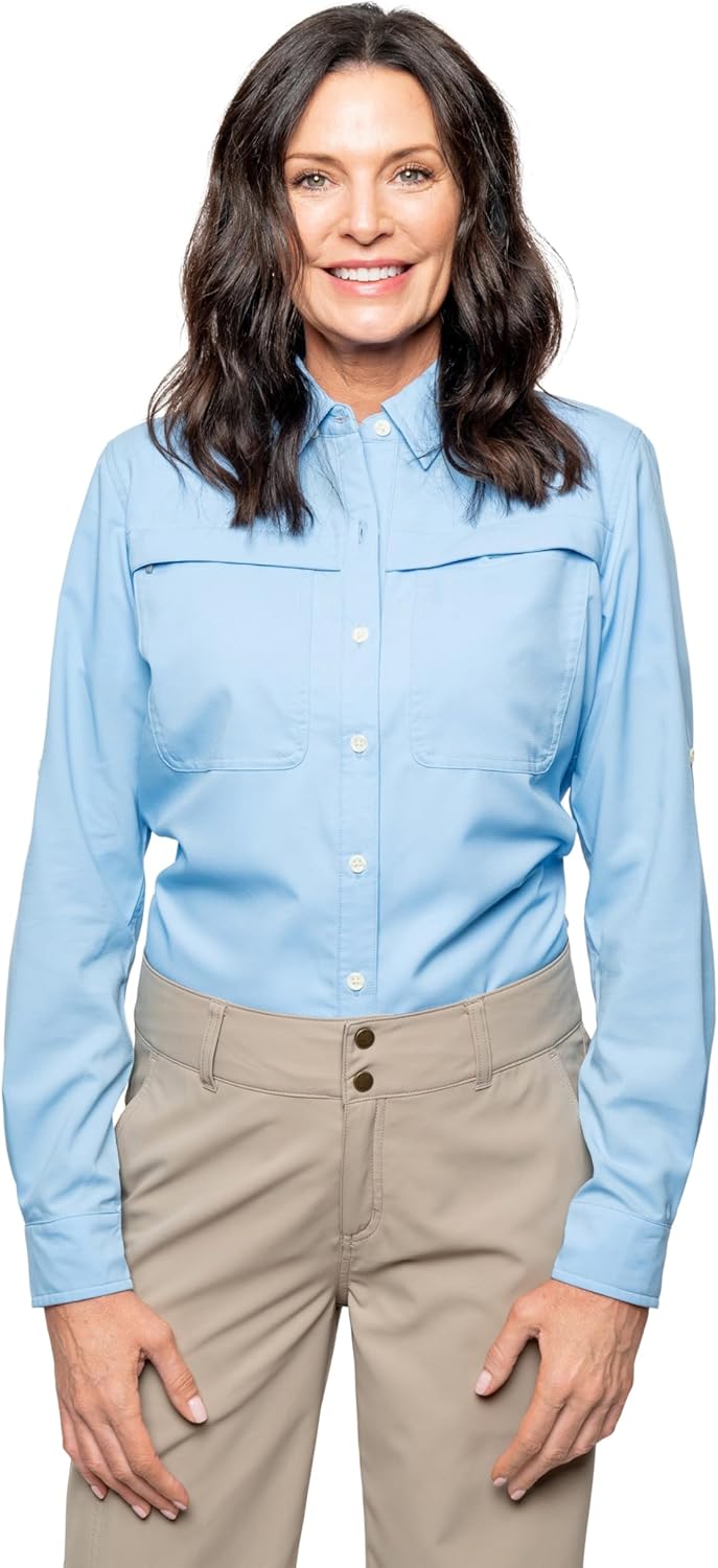 Repels mosquitoes, ticks, ants, flies, chiggers and midges EPA-registered permethrin repellent built into the fabric. 100% recycled polyester, 2.36 oz. Made from approximately 15 bottles. UPF 30+ sun protection. Quick dry, breathable and wicking. Right front pocket with zipper closure. Left front pocket with hook and loop closure. Roll-up sleeve tabs. Back cape with mesh vent. Hidden button down collar. Normal home laundering is recommended. Do not dry clean.