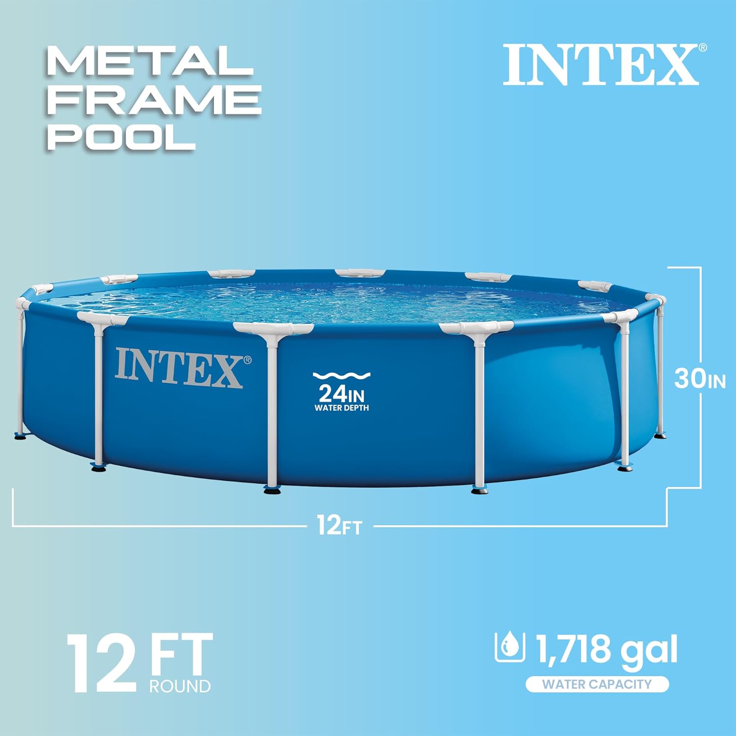 Beat the heat all summer with the Intex 12ft X 30in Metal Frame Pool. Engineered for strength, this pool is supported by strong, durable steel frames which are powder coated for rust resistance and beauty. Triple strong, SUPER-TOUGH laminated sidewalls are reinforced with an all-around band to keep frame legs firmly in place. This pool will make your backyard the place to be all summer as your family can relax and play. Ready for water in 30 minutes, - follow the instructions for easy set up, and enjoy the fun!