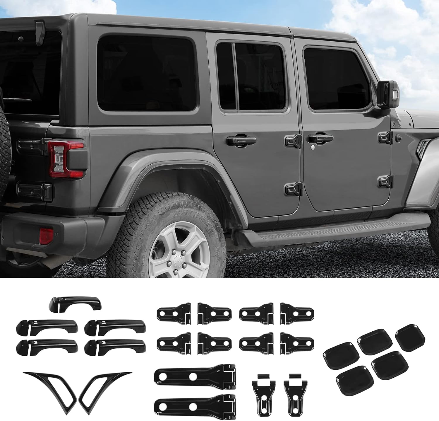 Fitment: - Compatible with Jeep Wrangler JL JLU 2018 2019 2020 2021 2022 2023 2 doors and 4 doors. (DO NOT fit 2018 JK) Features: - Color: Black with carbon Fiber Finish - Easy to install - Made of durable and long lasting ABS - Exterior accessories for Jeep Wrangler JL - Prevent your car from finger nails, key scratches Installation Guide: - Step 1. Use rubbing alcohol to clean all the place where the decorative trim cover will be pasted. - Step 2. After the alcohol has dried, heat the tape with a lighter or blower. - Step 3. Stick the decoration cover in the corresponding position. - Step 4. Hold the cover with pressure for a few minutes so the adhesive stick better. Package Included: - 2 x Hood hinge covers - 2 x Side vent covers - 2 x Tailgate hinge covers - 4 x Door handle covers - 1 x Tailgate handle cover - 5 x Door handle inserts - 8 x Door hinge covers