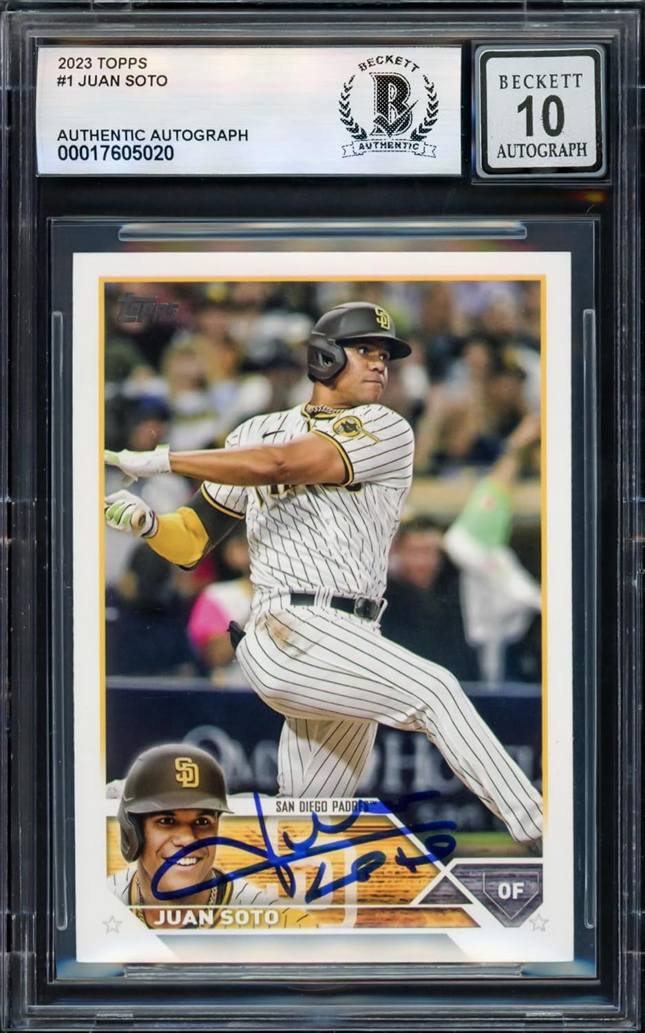 This is a 2023 Topps Card #1 that has been hand signed by Juan Soto. The condition of the signature was graded a Gem Mint 10 by Beckett BAS. It has been certified authentic by Beckett Authentication Services (BAS) and comes encapsulated in their tamper-proof holder.