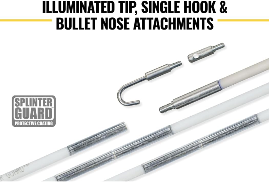 Klein Glow Fish Rods are the perfect solution for running wires through drop ceilings, attics, floors, walls and crawl spaces. This Mid flexibility rod is designed to bend enough to maneuver, but remain rigid to push longer distances. The Splinterguard coating glows bright yellow to quickly identify the right flex for the job and improves visibility in low-light applications. This 30-Foot rod includes a bullet and hook. For more than 160 years, Klein Tools has manufactured premium-quality, professional-grade hand tools that deliver the performance, durability and precision needed to get the job done right. Our family of engineers, workers and craftsman continue to put six generations of expertise into every tool we create by using only the highest quality materials, superior workmanship, and keeping manufacturing as close to home as we can. Klein isn't just the name of our company, it's also our family name. And since we're an American company that's family-owned and family-run, you know you can count on us to be here tomorrow. Klein Tools doesn't just make great products, we make great products that stand up to the demands of the professionals who use them every day ... Since 1857.