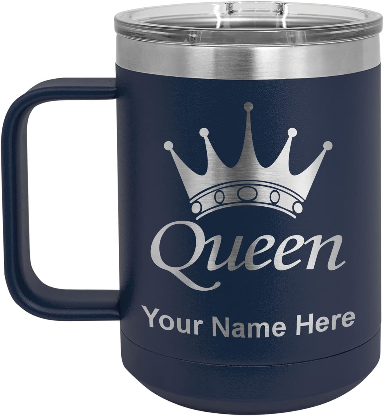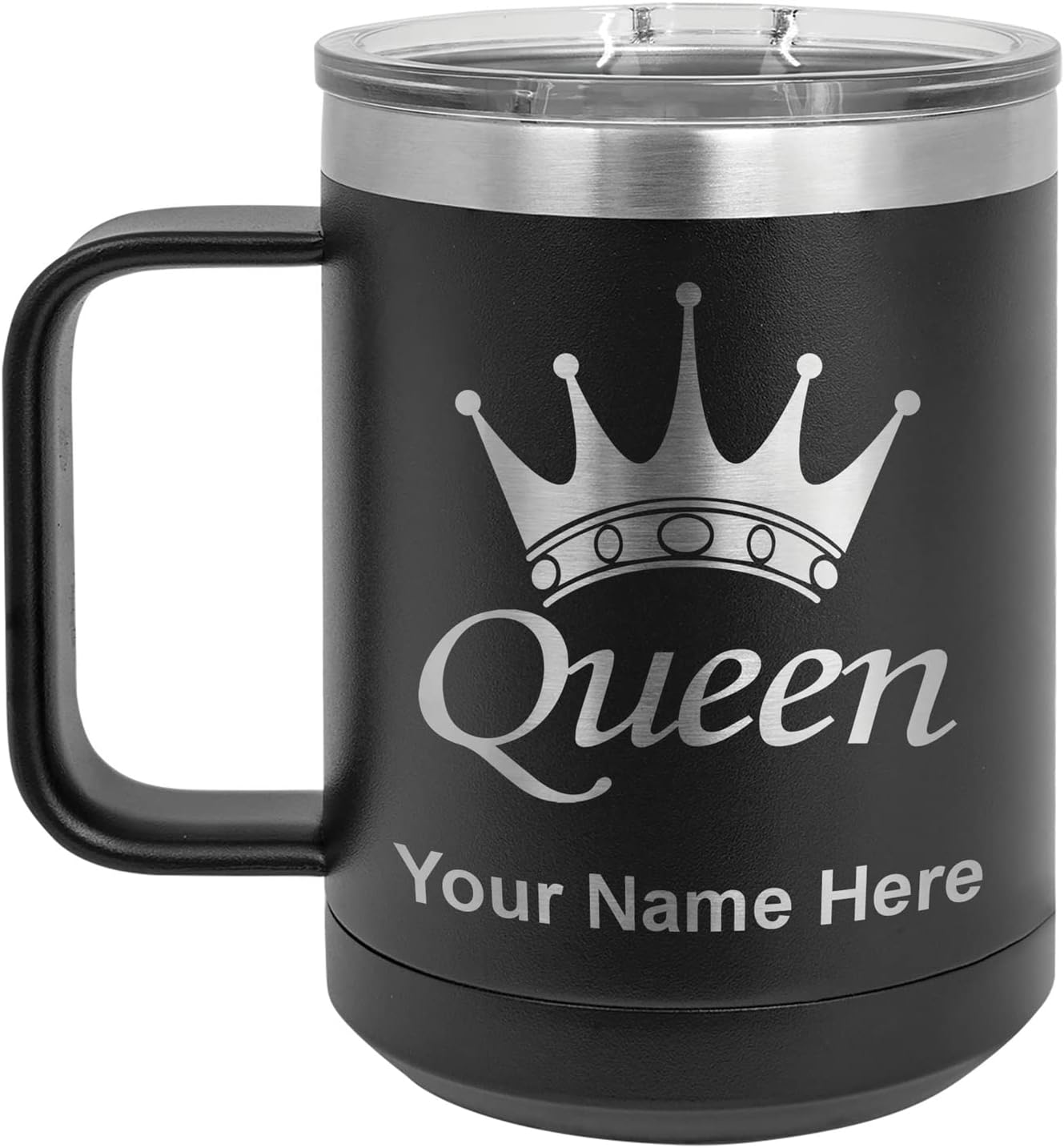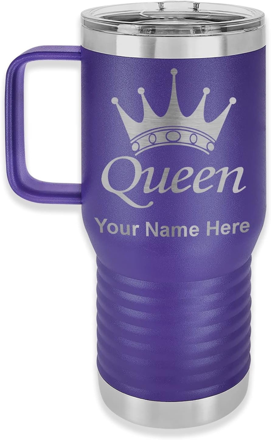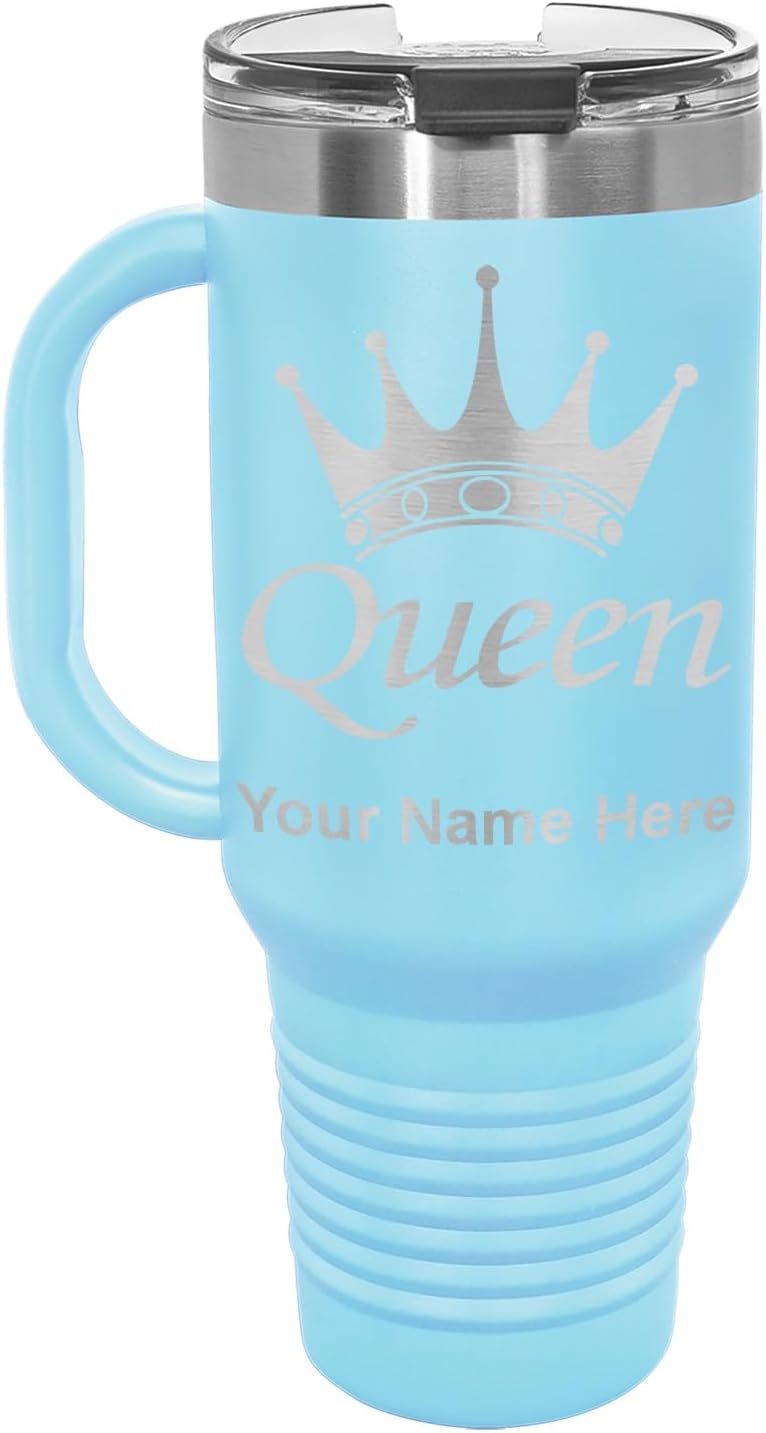 LaserGram 40 ounce Travel Mug with Handle that is laser engraved with the image that you see in the photo. Your own personalized text will be laser engraved below the image. Features double-walled stainless steel vacuum insulation with a clear lid. Click the "Customize Now" button to begin customizing your mug.
